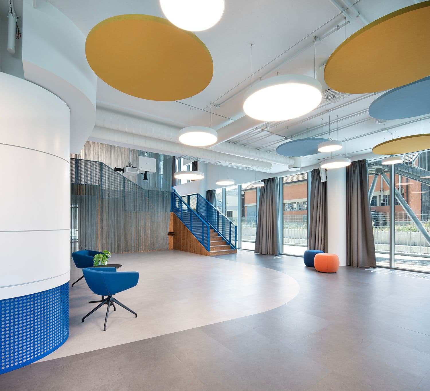 To guide the choice of shapes, lighting, colors, and materials, psychological tests were conducted with employees to understand their spatial needs. The insights gathered were then translated into the project’s design guidelines.