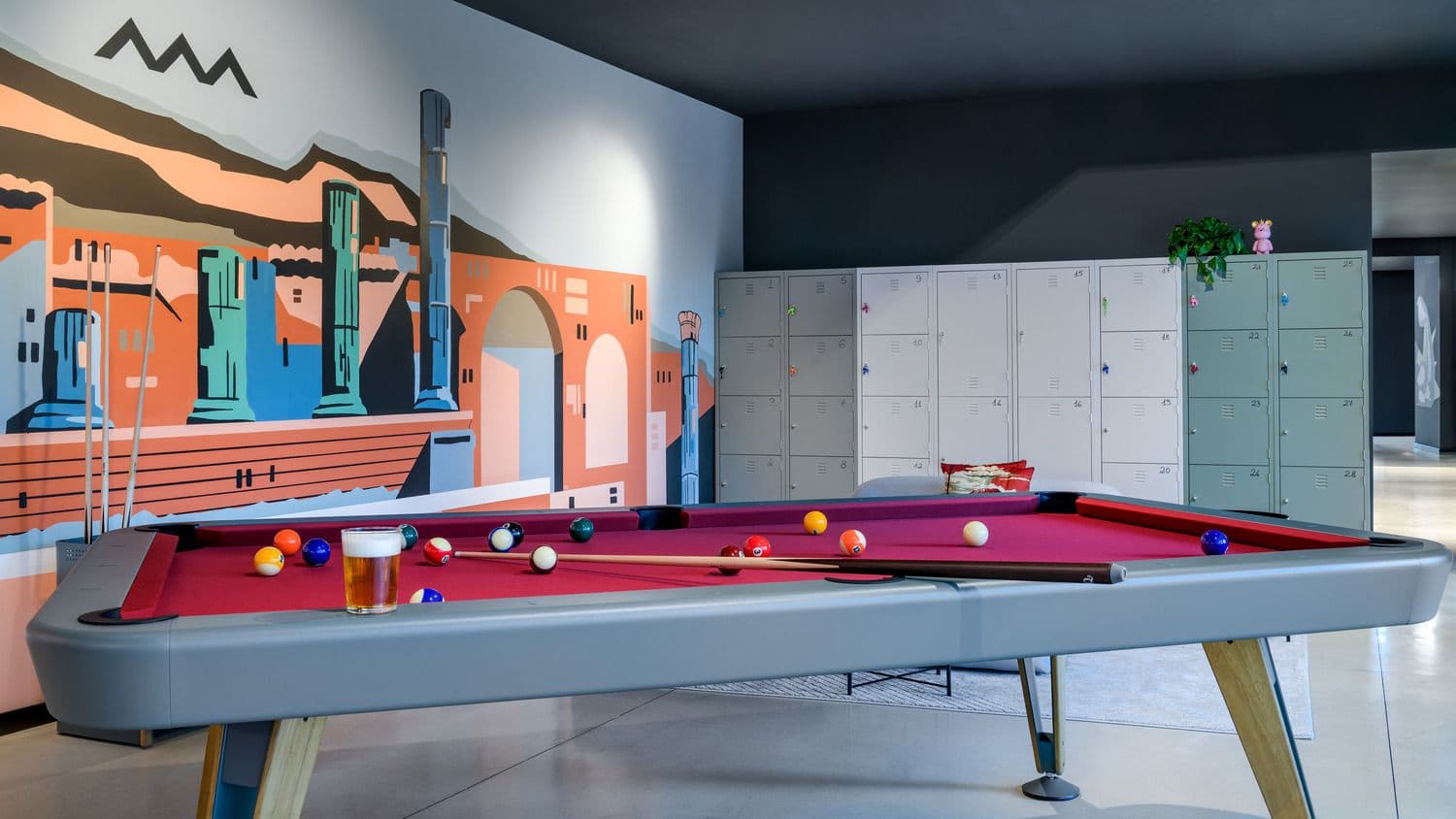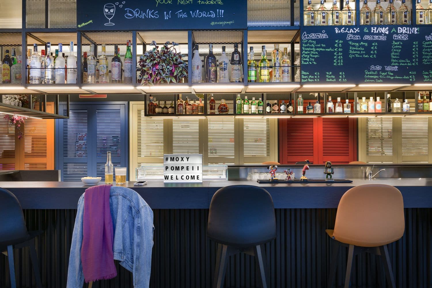 The project develops a neo-industrial pop aesthetic that offers a modern interpretation of Pompeii’s historical legacy. The frescoes of the ancient domus and the wall inscriptions serve as references for the graphics and identity of the common areas, reinterpreted through a street art lens. The heart of the project is the Fun&Play Lounge, a space designed to accommodate different moments of the day and flexible configurations of use. Here, the stepped seating evokes the Theatrum Magnum and the Theatrum Tectum, transforming an archaeological reference into a contemporary space for gathering, resting, and socializing. The whole creates an immediate, youthful experience deeply rooted in the site.