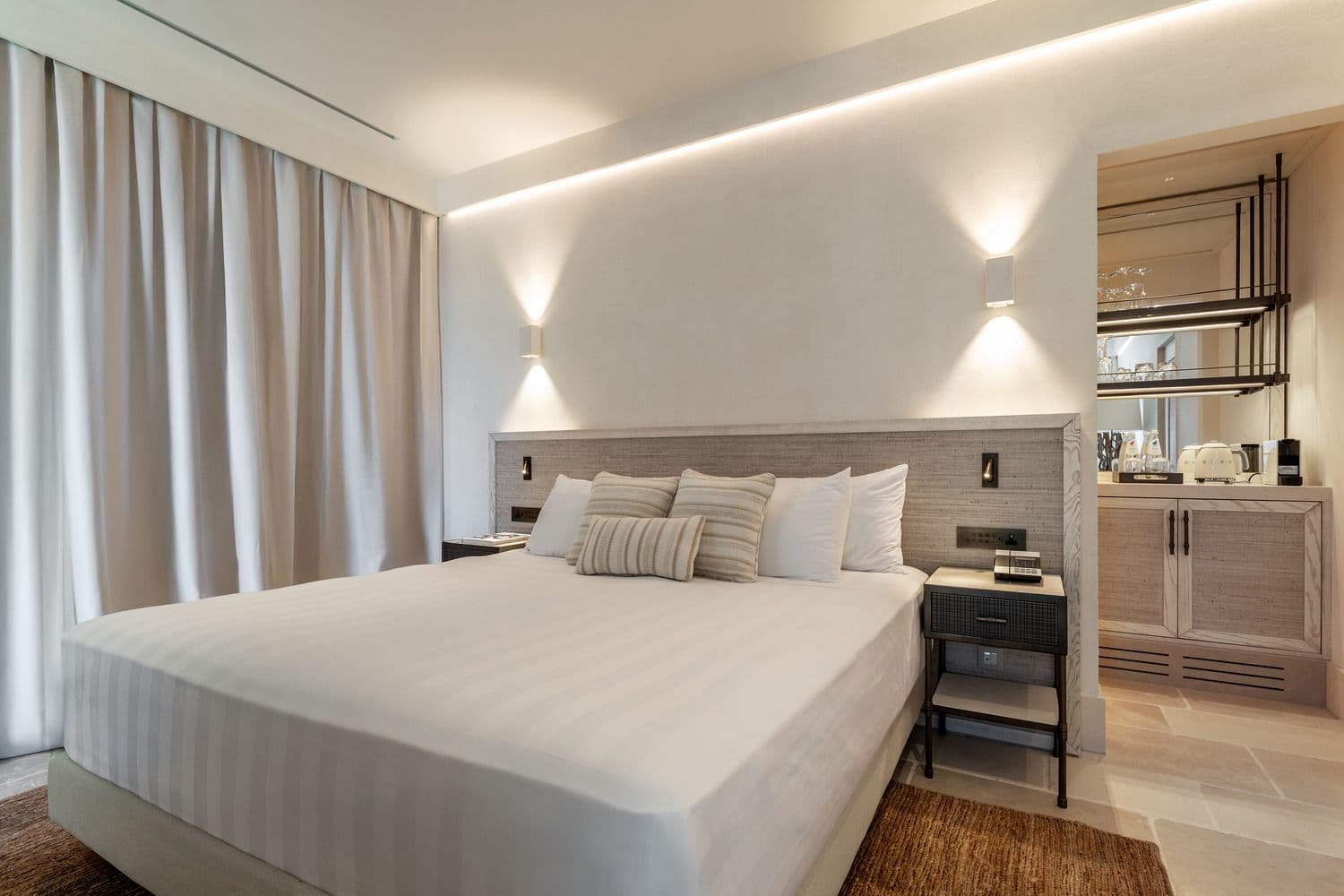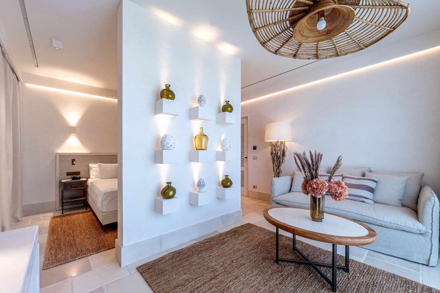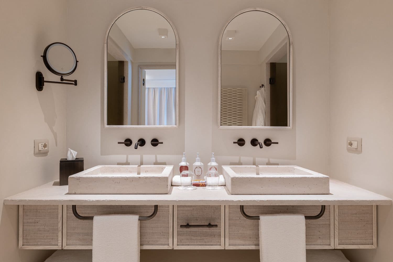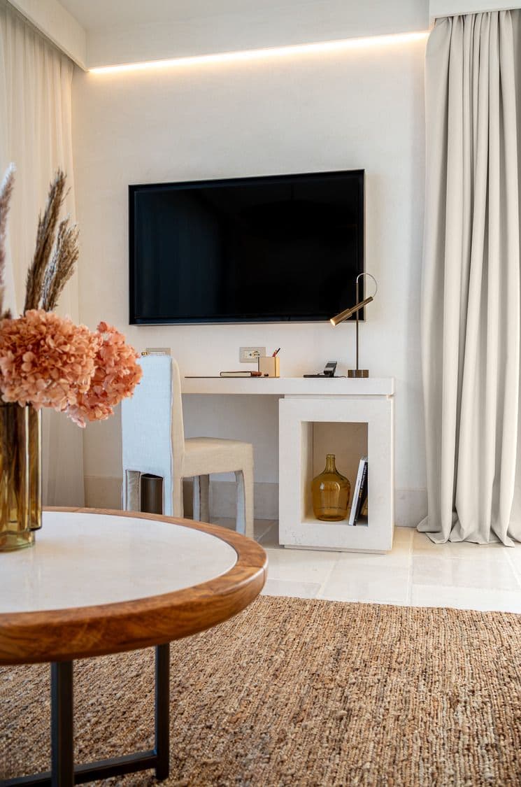 Extensive use of handcrafted weaves and nature-inspired color palettes narrates the masseria differently across each room type, combining high comfort with authenticity.