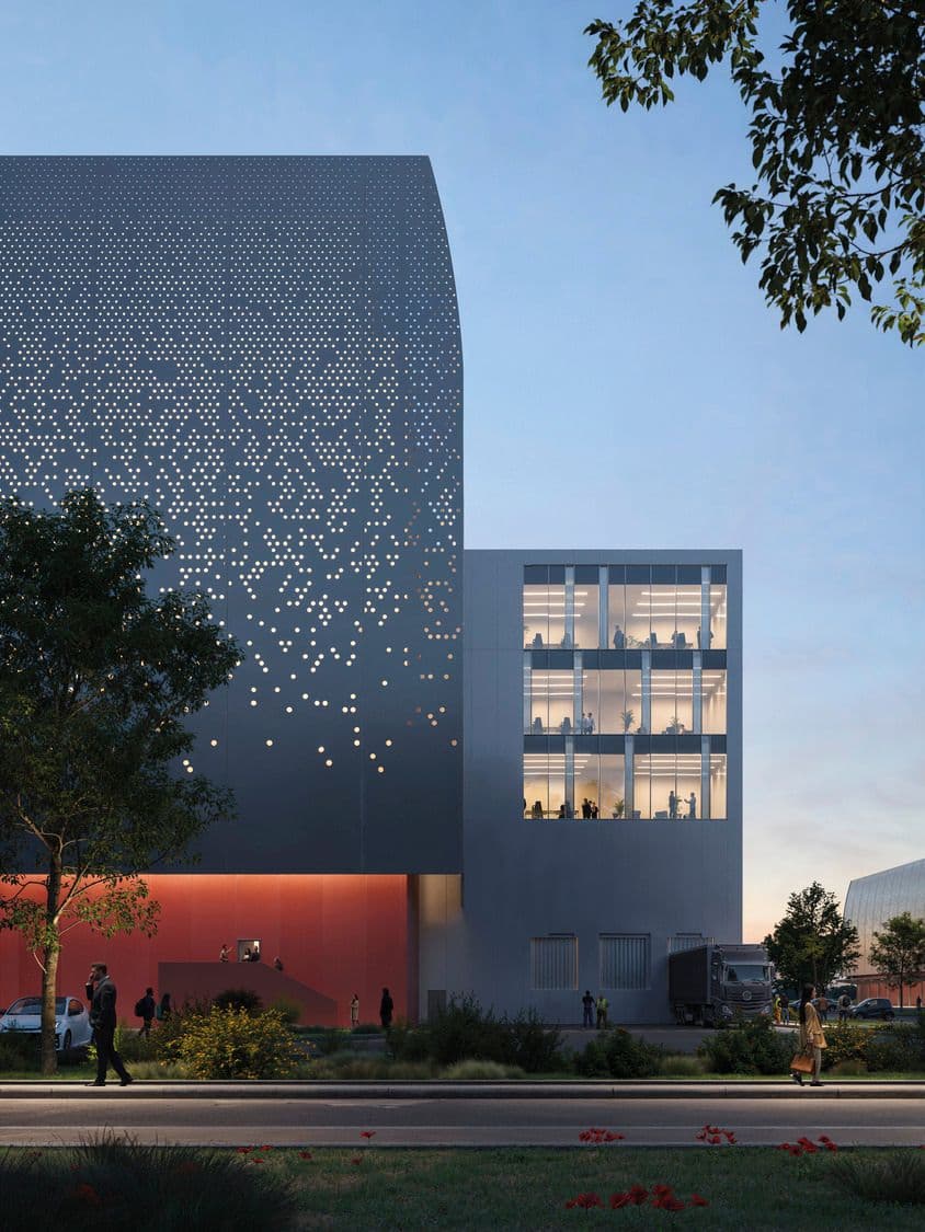 The neutral, uniform facades are punctuated by a red base, visually linking the new development to the architectural language of the area’s pre-existing manufacturing buildings. Technological rooftop elements are concealed with backlit micro-perforated panels, forming a light, reflective, and semi-transparent aluminum surface that softens the visual impact and enhances the project’s aesthetic quality.