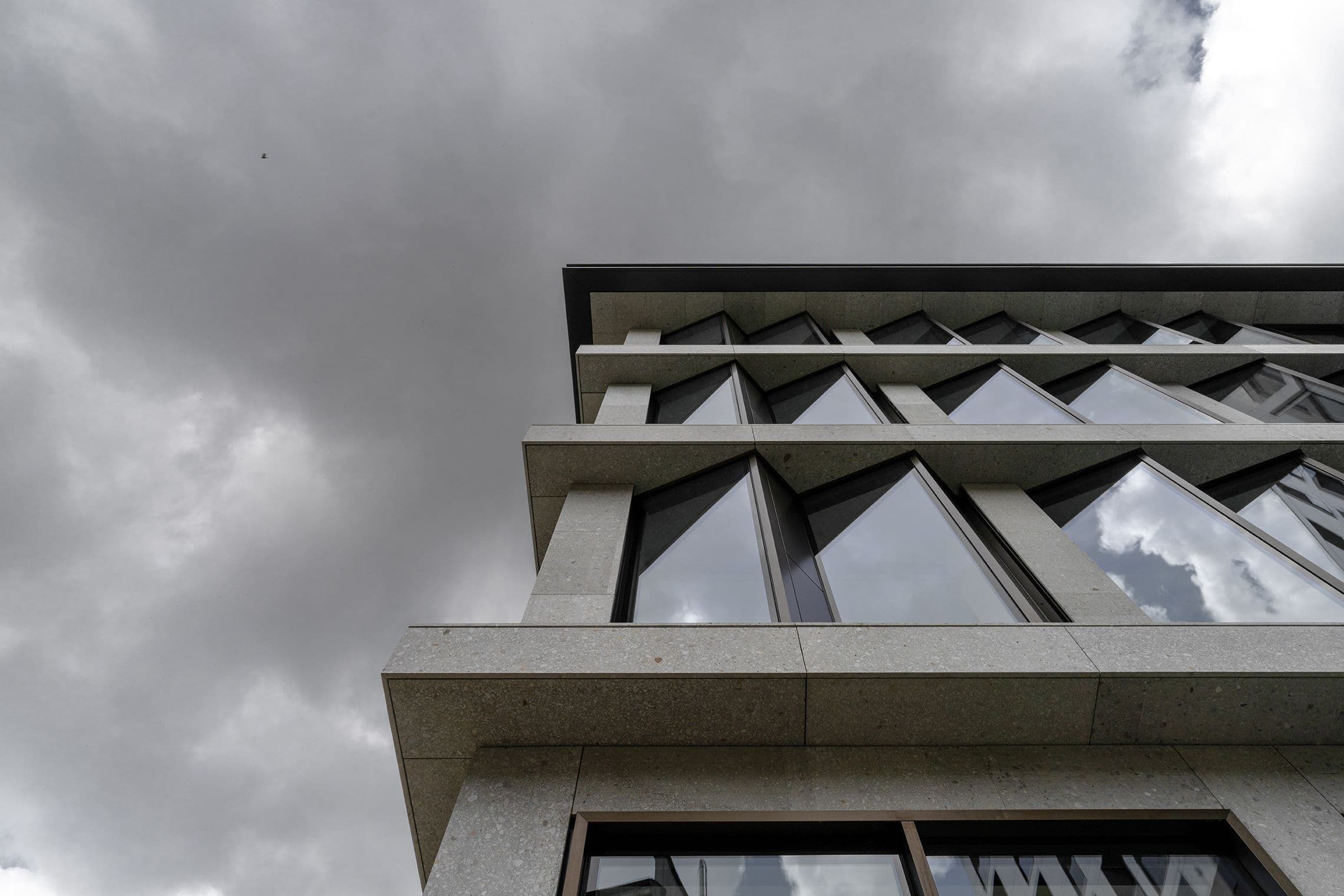 The intervention on the building at Corso di Porta Vigentina 9 in Milan retains the original structural frame while replacing the envelope. The main façade is articulated by 1.5 × 3 m modules rotated northward, combining glazed sections with opaque bronze-anodized aluminum insulated panels. Engineered stone spandrels mark floor levels.