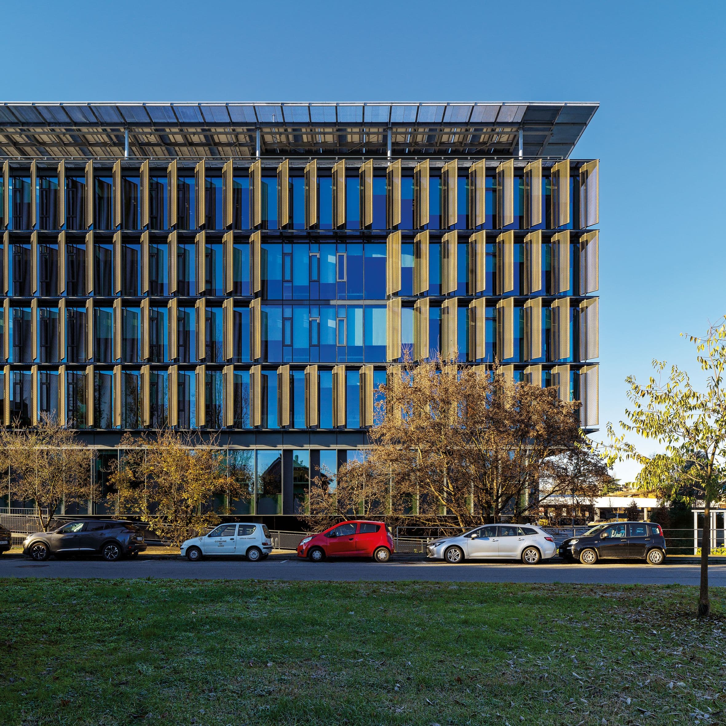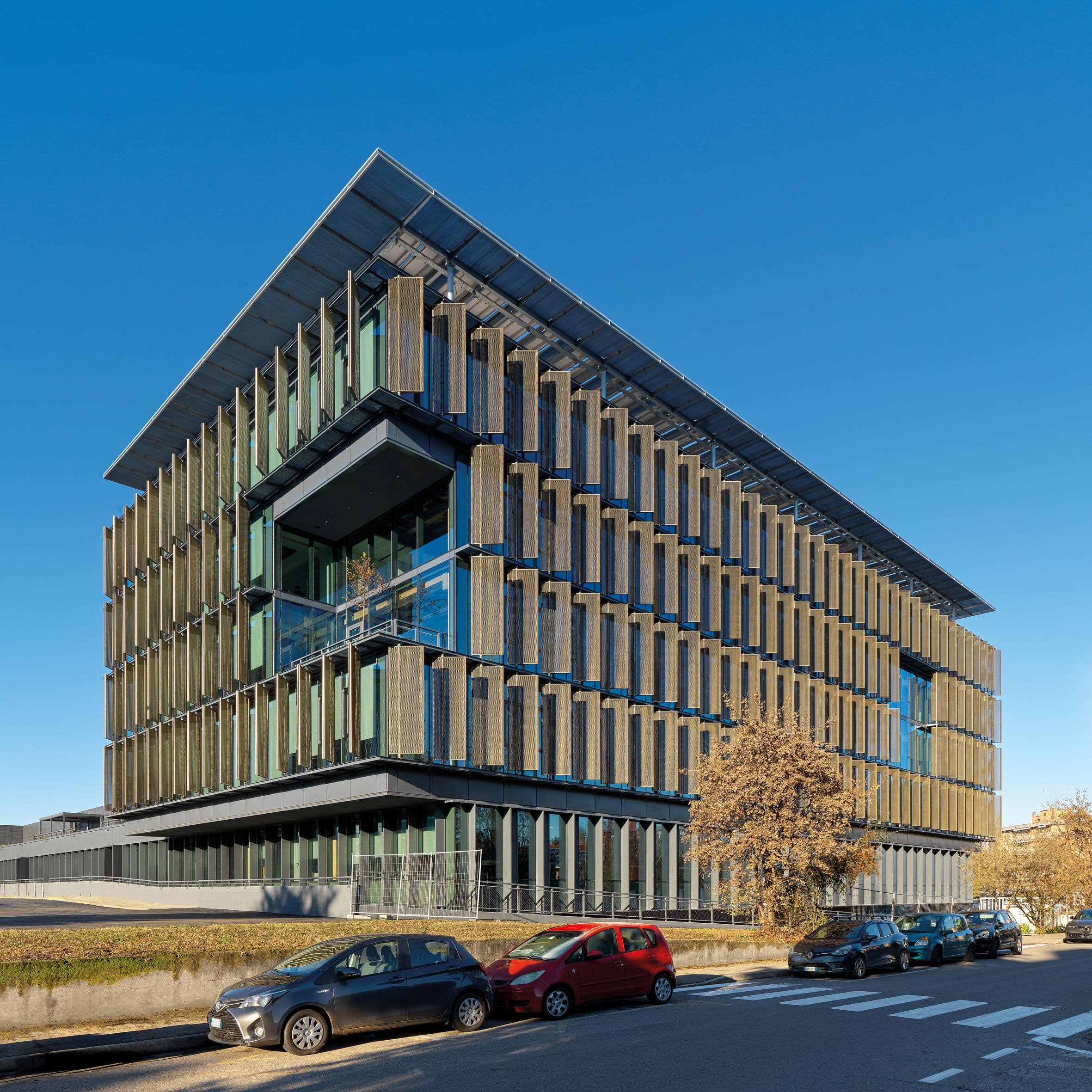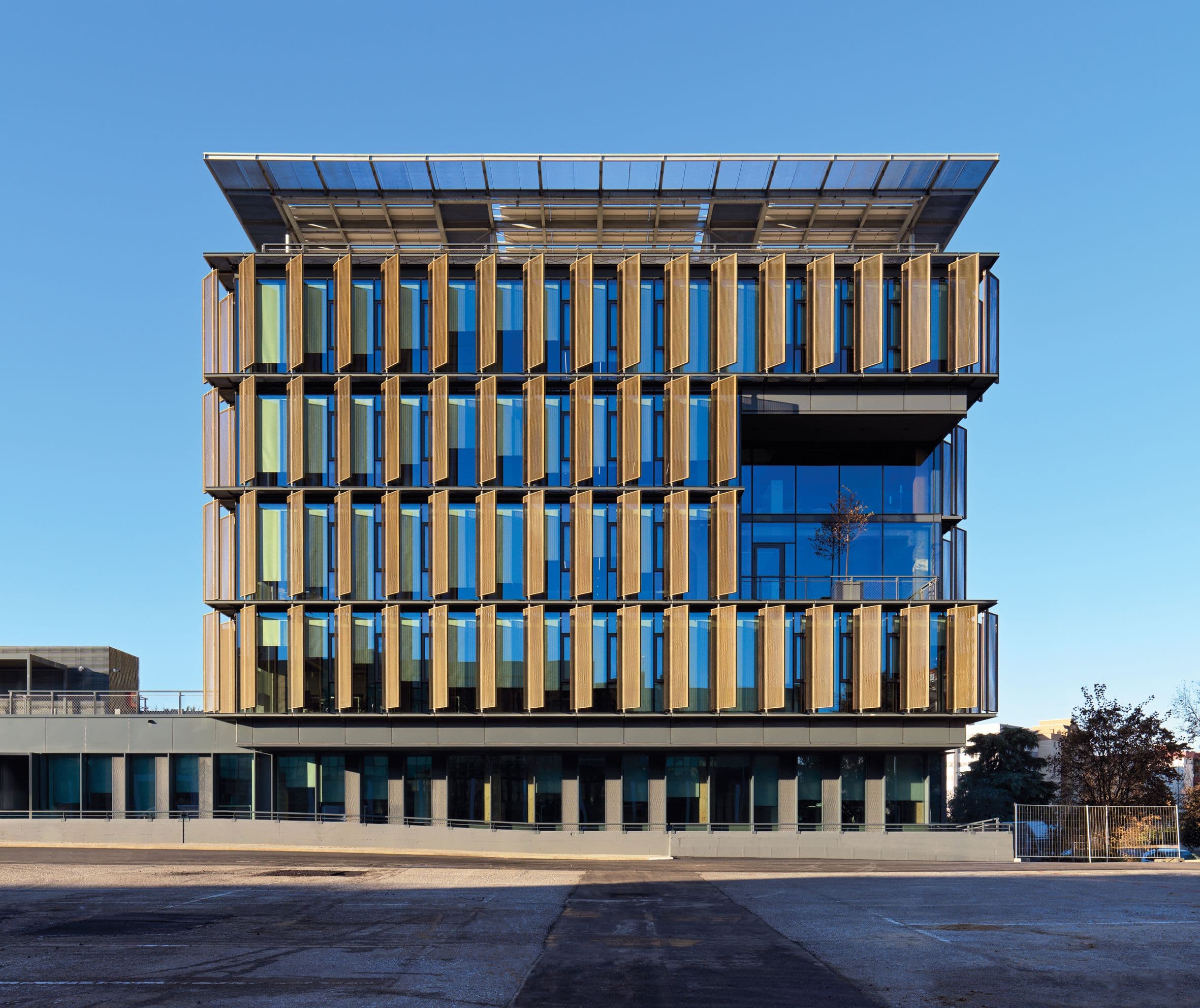 Offices, restaurant, café, wellness facilities, auditorium, client areas, and training spaces are distributed over two levels. A new building in laminated timber and reinforced concrete on the eastern side completes the system, featuring terraces and a glazed ventilated façade that enhances daylighting, comfort, and environmental performance.