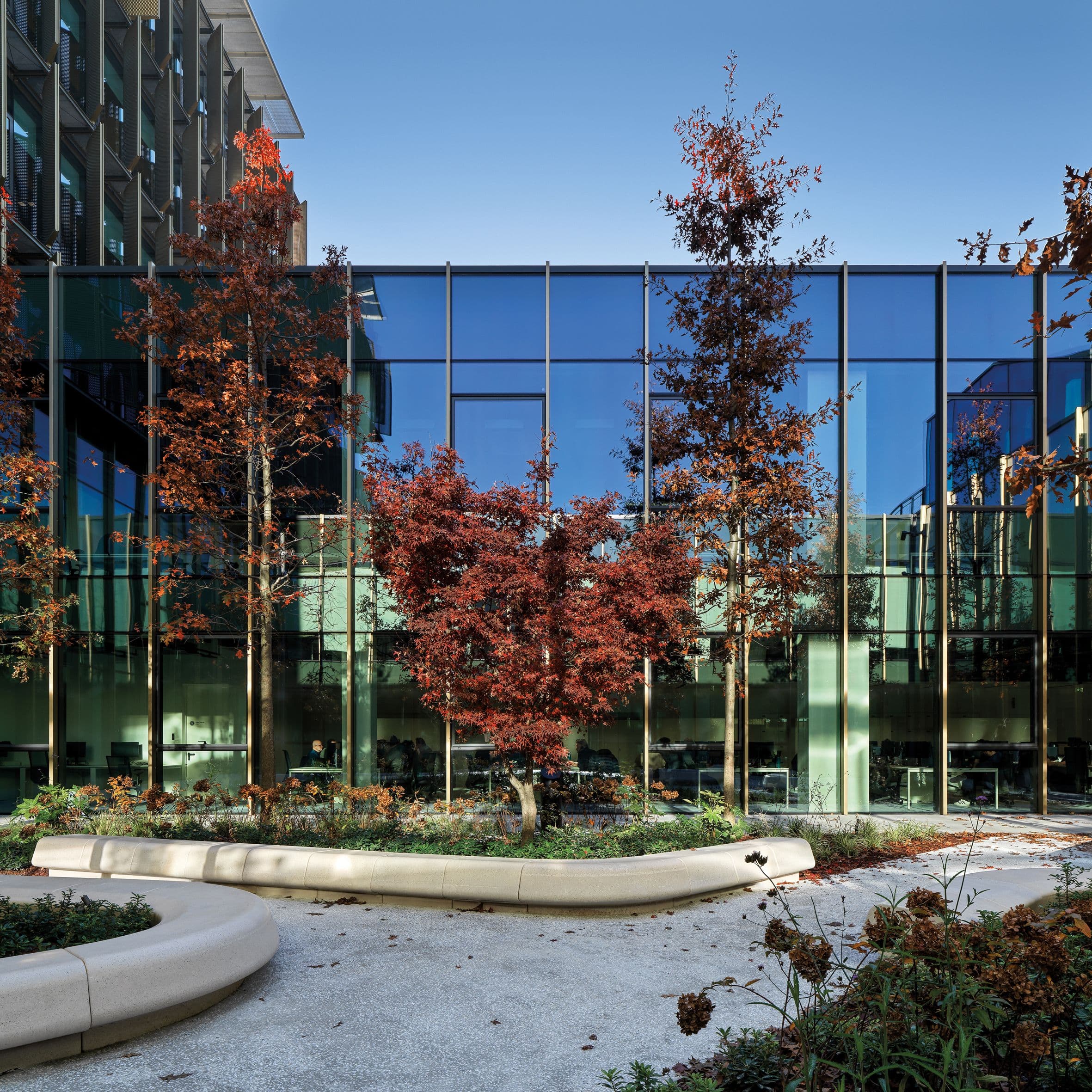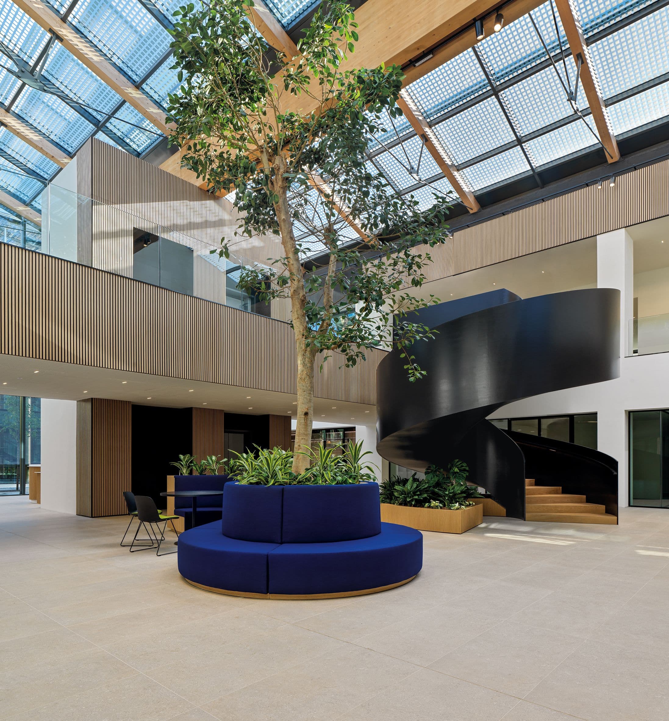 The reuse of existing structures and the use of approximately 1,600 cubic meters of laminated timber allow CO₂ storage, turning the complex into a low-carbon laboratory for urban regeneration.