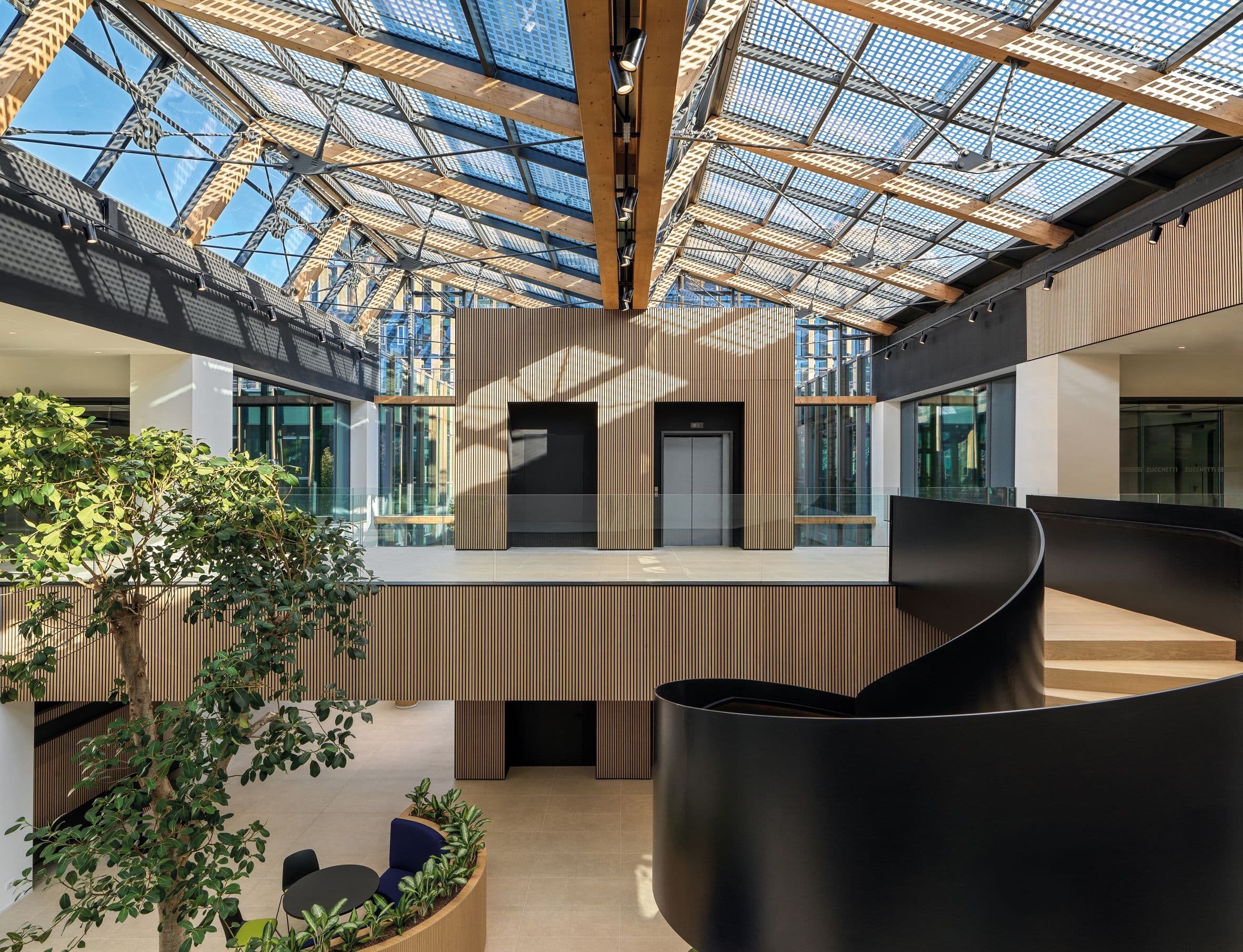 The new Zucchetti Village reconfigures the office tower and the former My Lodi shopping mall into an open campus. The existing podium slab is lightened and hollowed out at its center to create two open-air courtyards, a double-height bioclimatic greenhouse, a main lobby, and a new circulation hub.