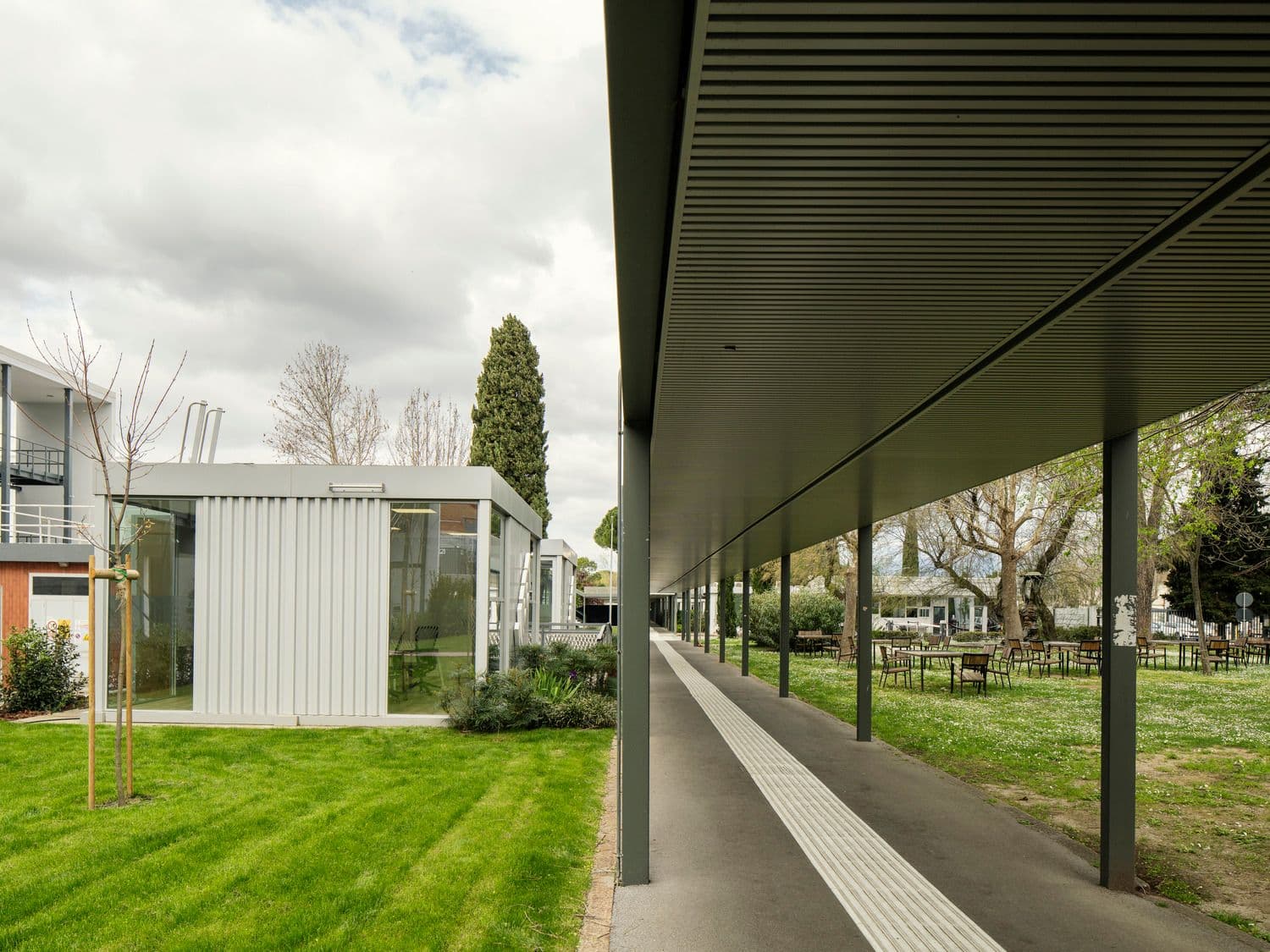 Quattro edifici sono stati sopraelevati di un piano e collegati da tettoie che danno forma a nuove piazze coperte, spazi per eventi e percorsi protetti. Le serre bioclimatiche assicurano continuità ai percorsi interni e contribuiscono al miglioramento del comfort ambientale, mentre la nuova mensa del complesso ospita La Fabbrica dell’Aria®, un sistema botanico per la filtrazione naturale dell’aria.
