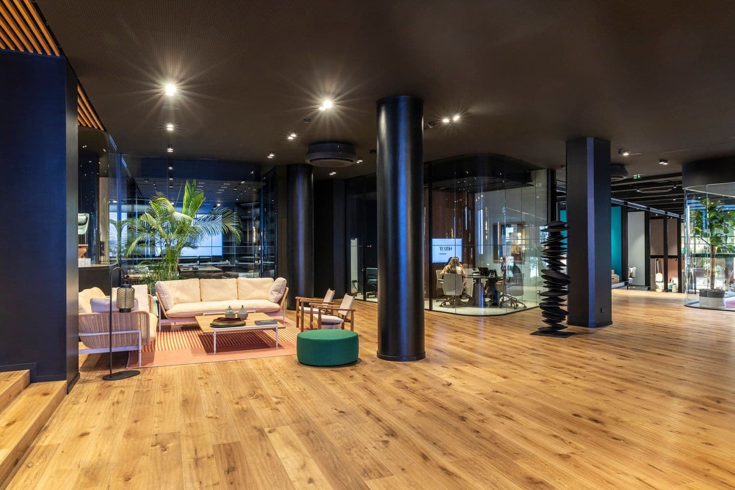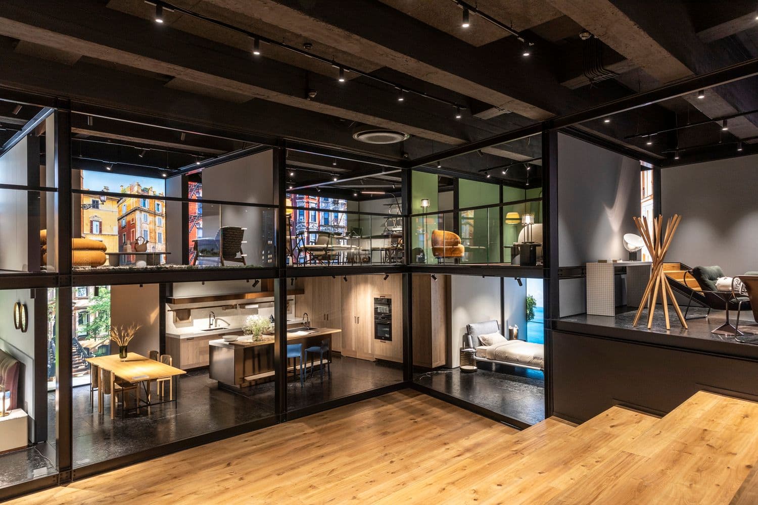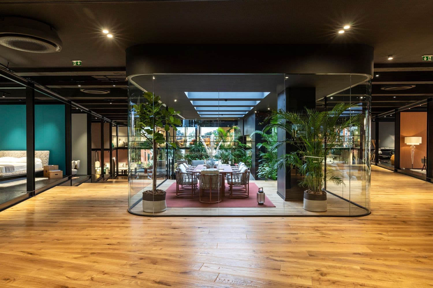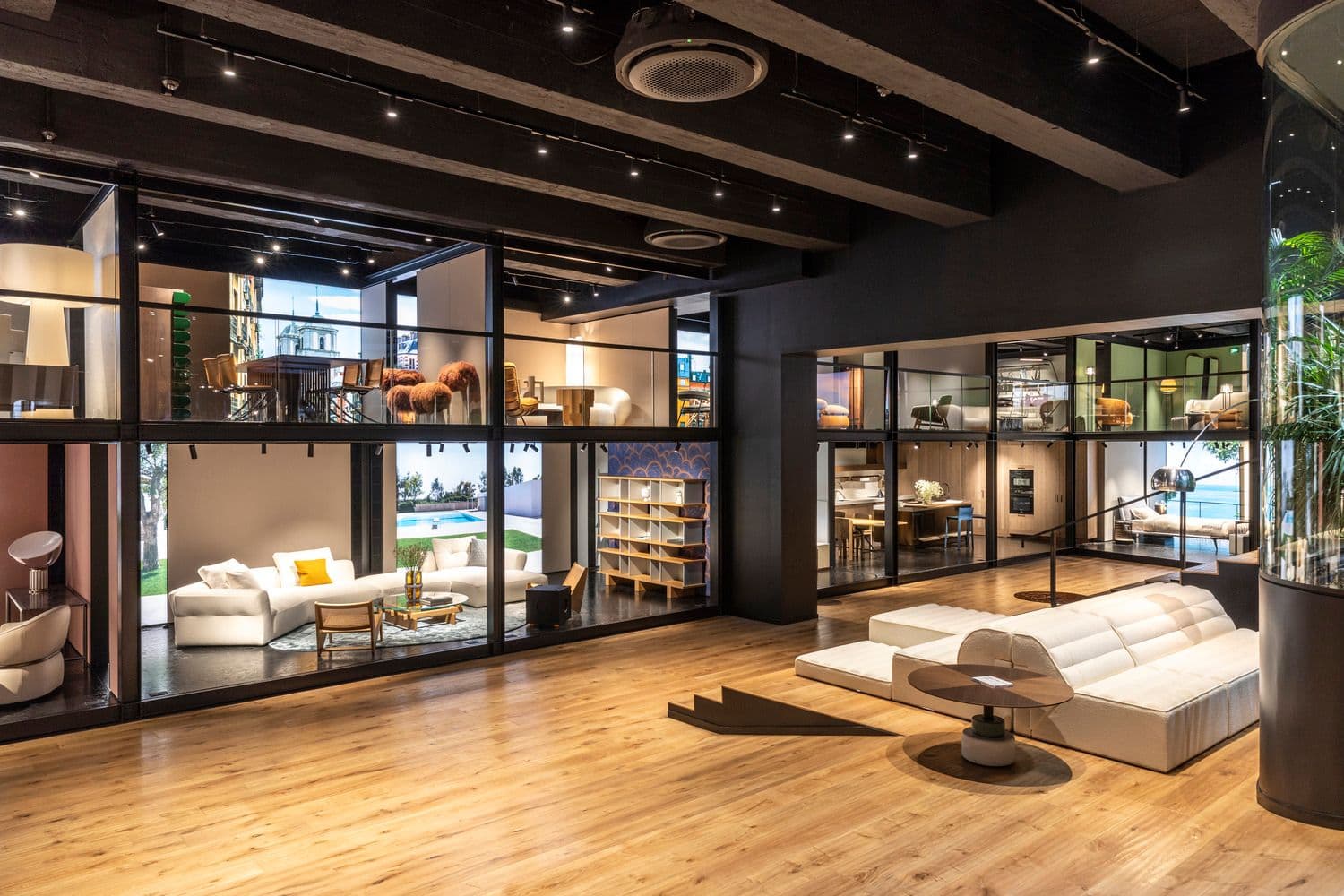 Lo showroom integra due negozi monobrand già esistenti, Poltrona Frau e Cassina, adiacenti e tra loro collegati, insieme a un nuovo monobrand Vitra, all’interno di un unico organismo articolato di 1.410 mq. Una quinta scenografica avvolge il perimetro su tre lati, articolandosi in una composizione modulare di ventisei stanze espositive, a singola e doppia altezza. Al centro, un “giardino virtuale” definisce uno spazio dedicato agli arredi outdoor.