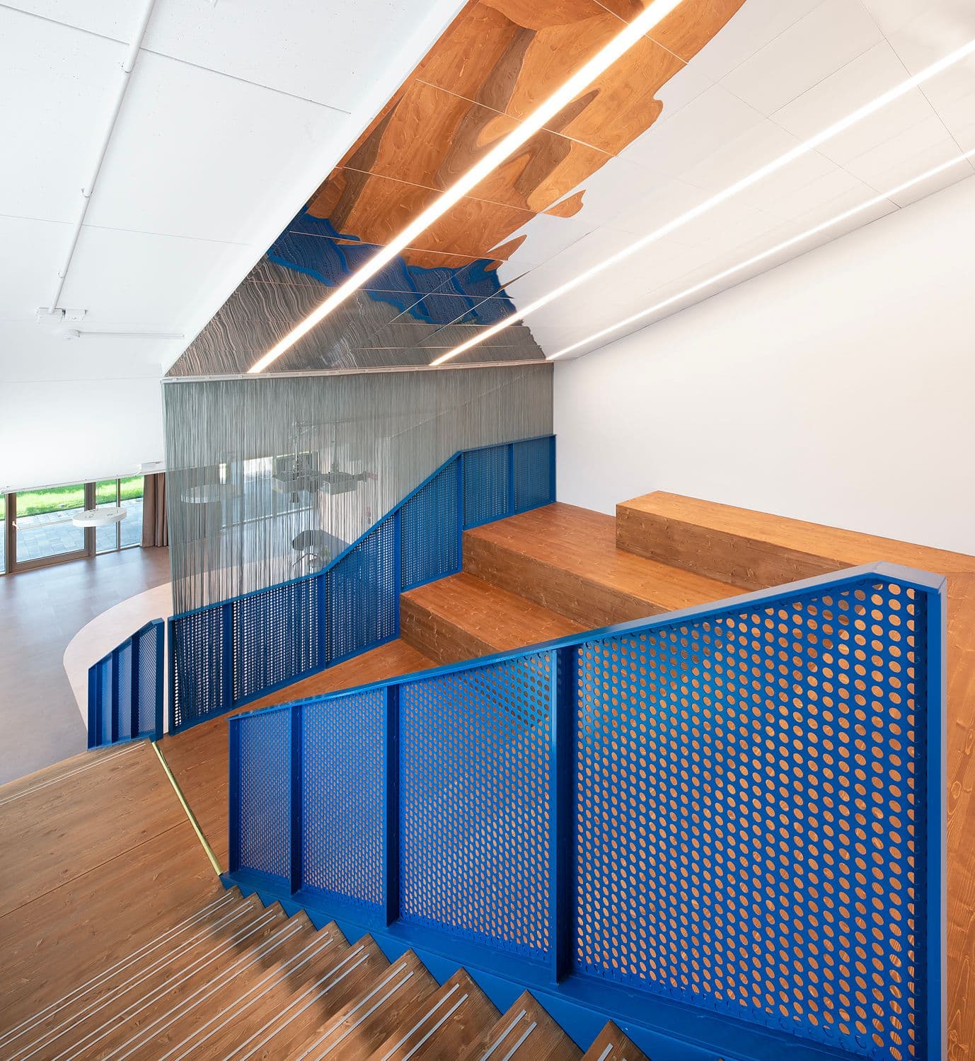 Il progetto riqualifica uno spazio inizialmente basato su un impianto rigido, riconfigurandolo in chiave modulare e flessibile. Al piano terra trovano posto reception, info point, corridoio esperienziale e training room divisibile pensata per attività formative in gruppo, mentre schermi interattivi accompagnano i percorsi e supportano l’apprendimento. Una gradonata con controsoffitto specchiato conduce al primo piano, dove si sviluppano un auditorium multifunzionale da oltre 60 posti, uno spazio open per start up e aree touchdown. Il tunnel di collegamento interno è caratterizzato da pannellature acustiche e illuminazione a LED, materiali e finiture scelti per la loro capacità di garantire durabilità, comfort e controllo energetico.
