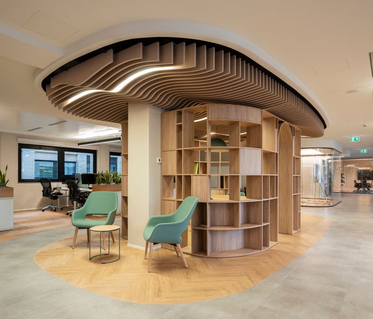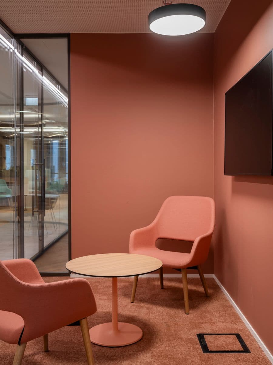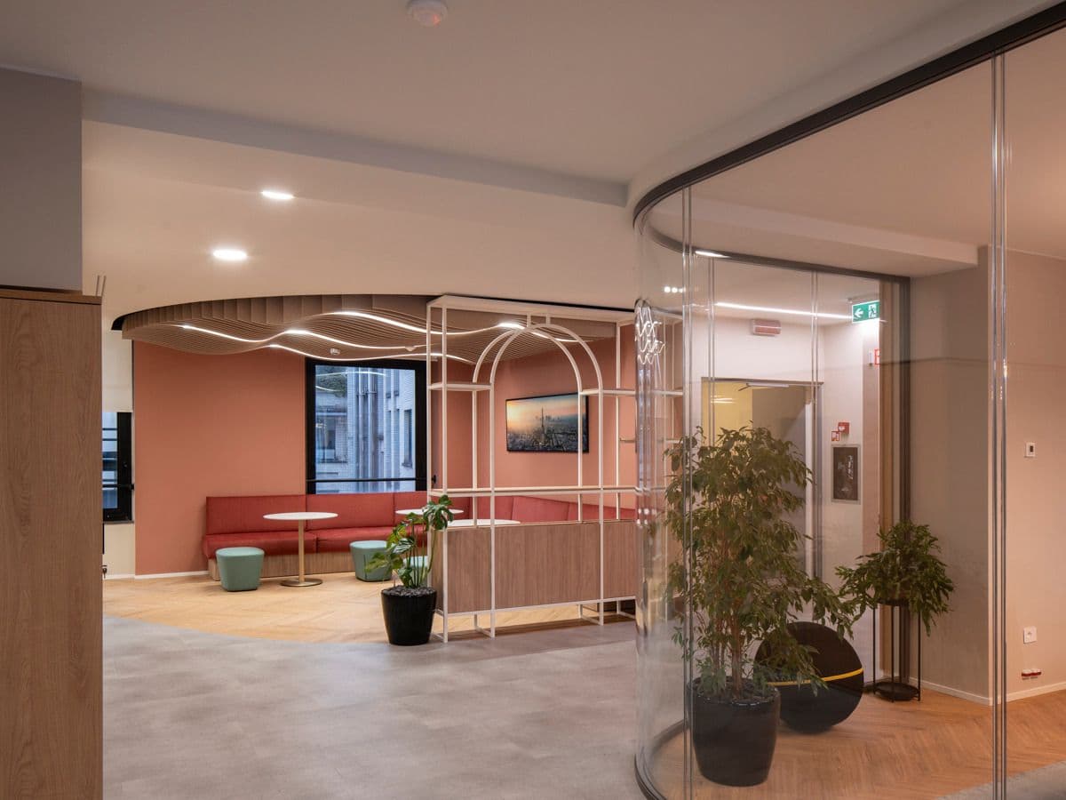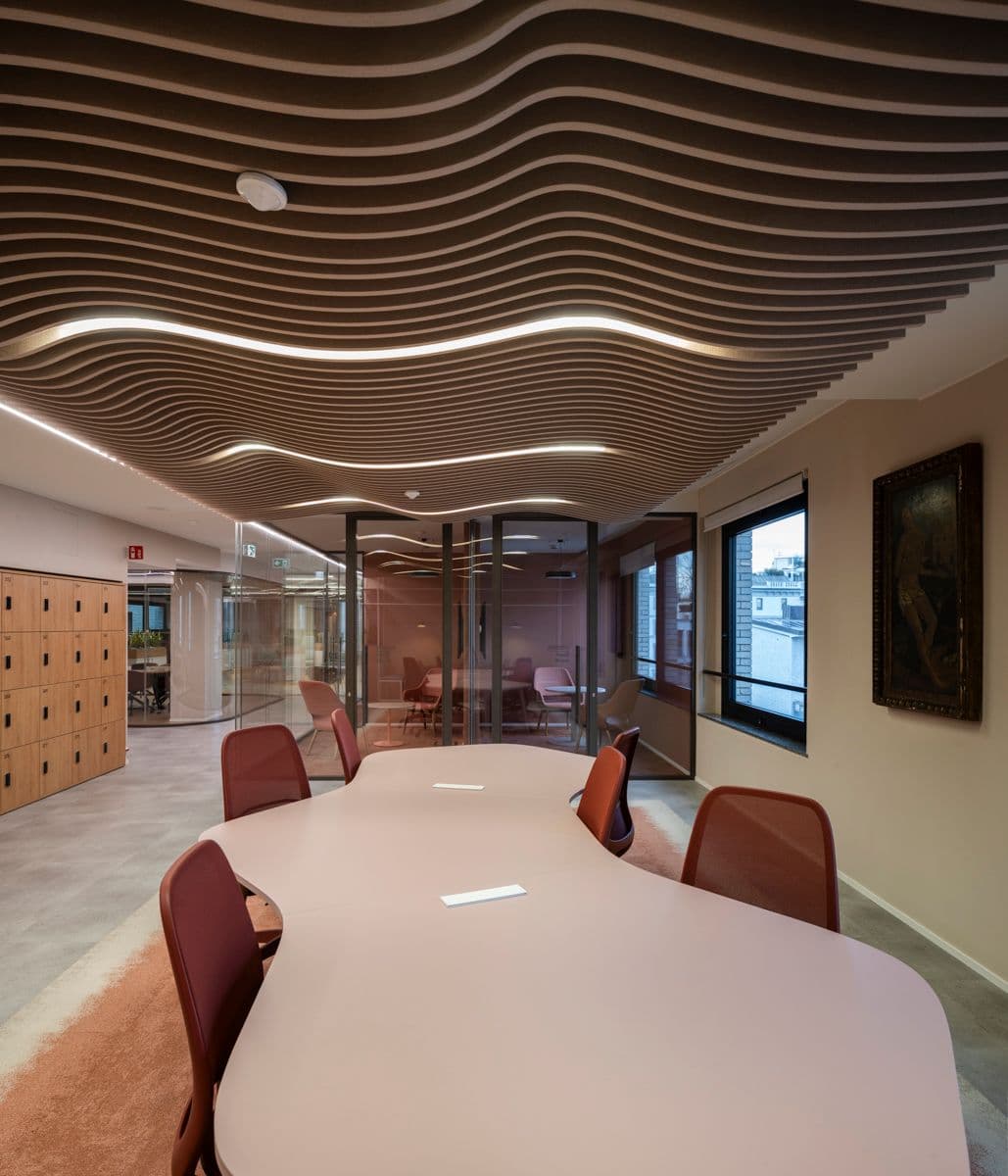 L’intervento riguarda il 3° e 4° piano della struttura, rinnovati per offrire maggiore versatilità e adattabilità alle necessità aziendali, garantendo il massimo comfort anche dal punto di vista acustico, grazie all'impiego di pannelli fonoassorbenti e soffitti progettati ad-hoc.