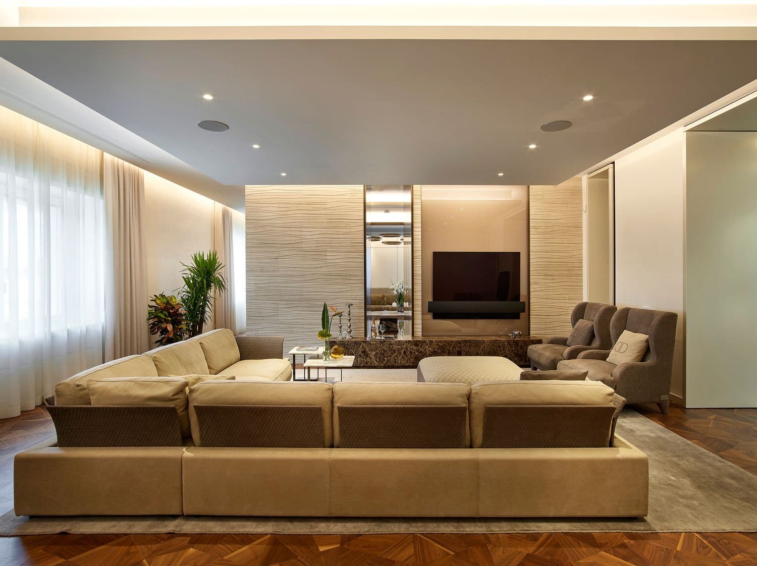Il progetto costruisce l’identità interna della zona living dell’edificio tramite ambienti scanditi da eleganti modanature e tonalità chiare del bianco e madreperlaceo. La verticalità degli spazi viene enfatizzata dall’uso della pietra chiara e da ampie trasparenze vetrate, con un grande lampadario sospeso che contribuisce a definire l’atmosfera luminosa e rilassata dell’abitazione. Tutti gli elementi sono coordinati per trasmettere una percezione di equilibrio, sobrietà e comfort.