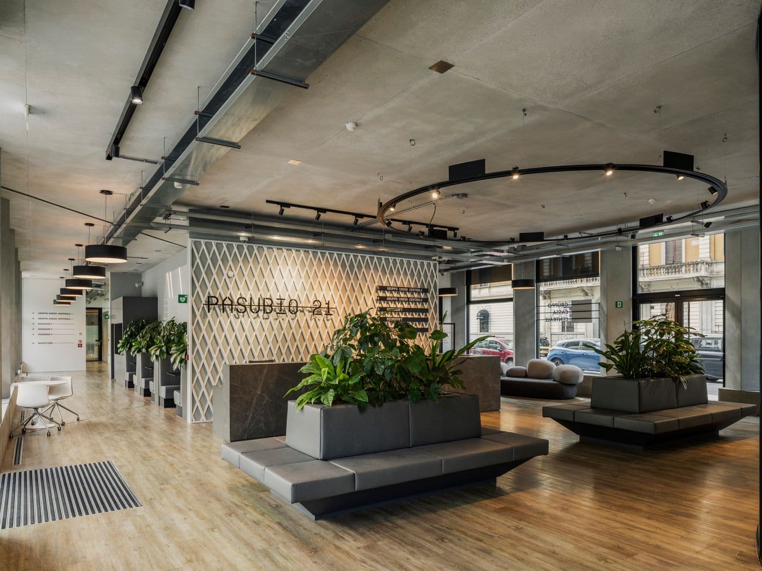 Gli ambienti di lavoro sono pensati per favorire operatività, flessibilità e scambio, alternando postazioni dedicate a spazi per riunioni informali e momenti di confronto. Il livello di rappresentanza si affaccia su un’area eventi a grande altezza che stabilisce una relazione visiva e funzionale tra i diversi ambiti, rafforzando il carattere istituzionale dell’intervento. Gli arredi su misura, declinati nei colori del brand, accompagnano la continuità degli spazi, dagli uffici alle sale riunioni fino alle aree più informali, contribuendo a una lettura unitaria del progetto. La lobby condivisa dell’edificio è reinterpretata come spazio di accoglienza dedicato, in cui reception, elementi di riconoscibilità e percorsi riservati definiscono in modo chiaro l’accesso al quartier generale. Il progetto illuminotecnico, calibrato sulle diverse funzioni, sostiene le attività quotidiane, l’accoglienza e gli eventi, rafforzando il ruolo dello spazio come strumento di rappresentazione.