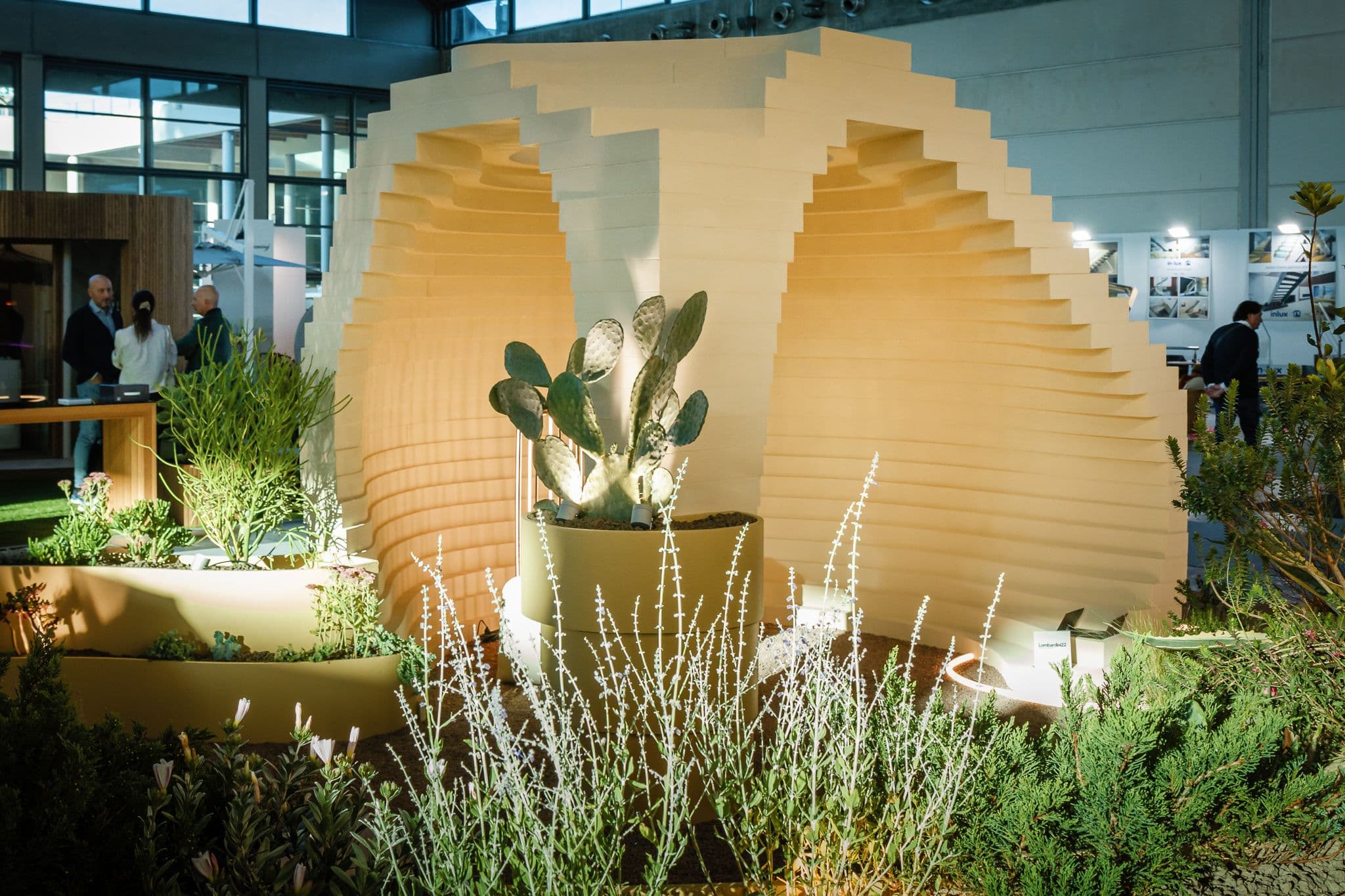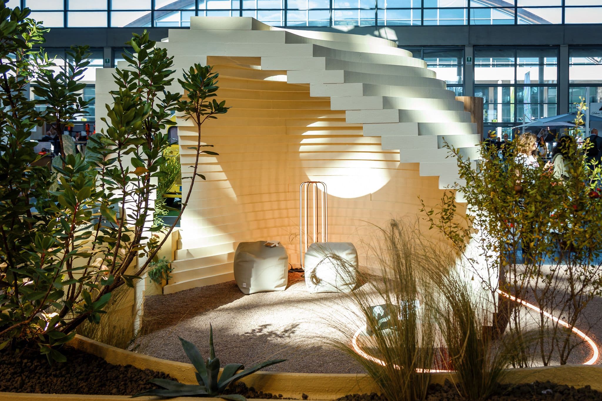 Tutte le suggestioni dell’universo subacqueo – pattern modulari, texture materiche, cromie e giochi di luce – sono state sintetizzate dall’AI e rielaborate in immagini, selezionate poi tramite criteri precisi. Il risultato è una struttura di quattro elementi semiaperti in lastre sovrapposte, un sistema modulare progettato attraverso un algoritmo generativo in grado di restituire un microspazio che evoca la stratificazione naturale delle rocce e consente la creazione di aggregazioni complesse.