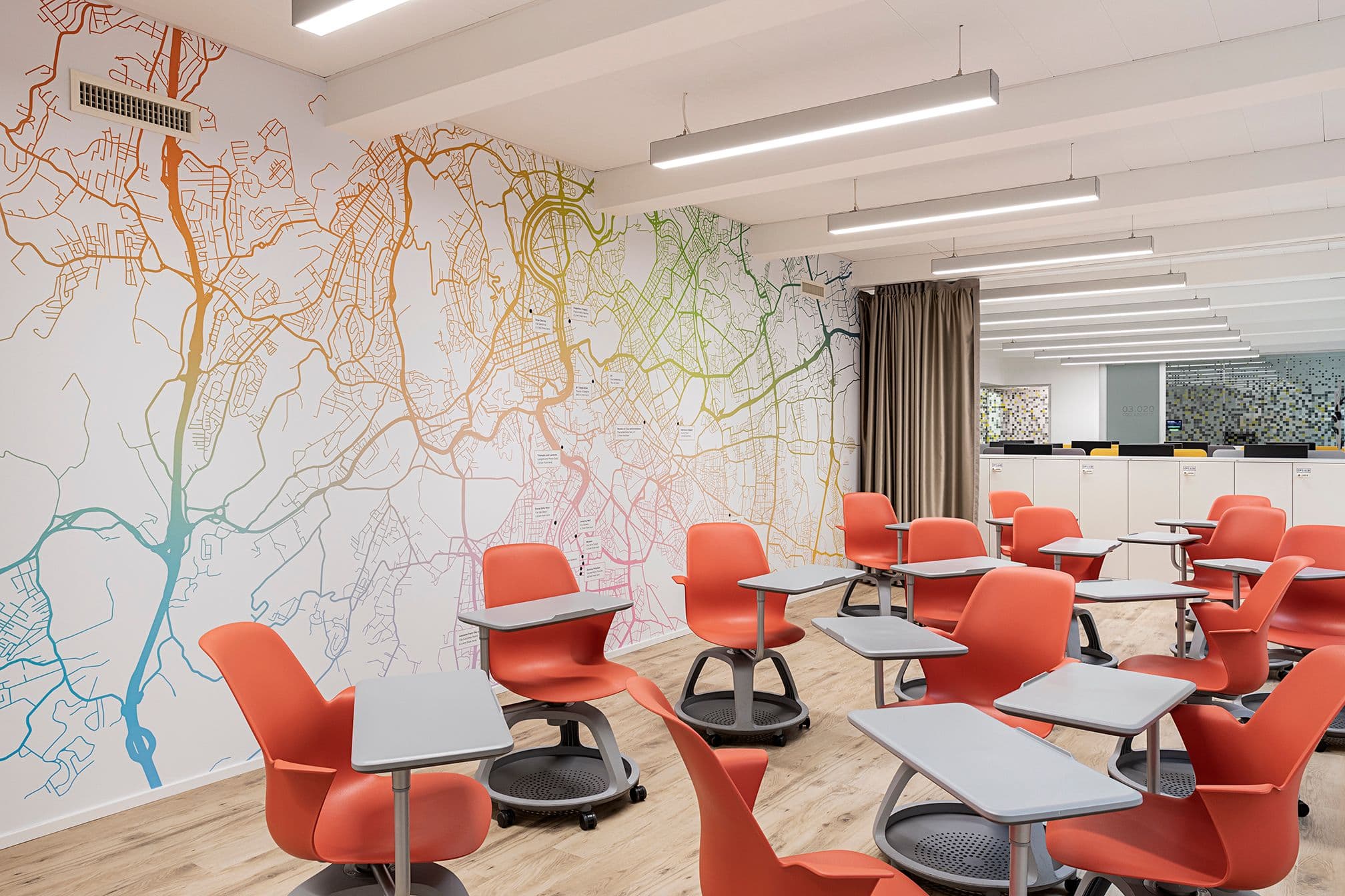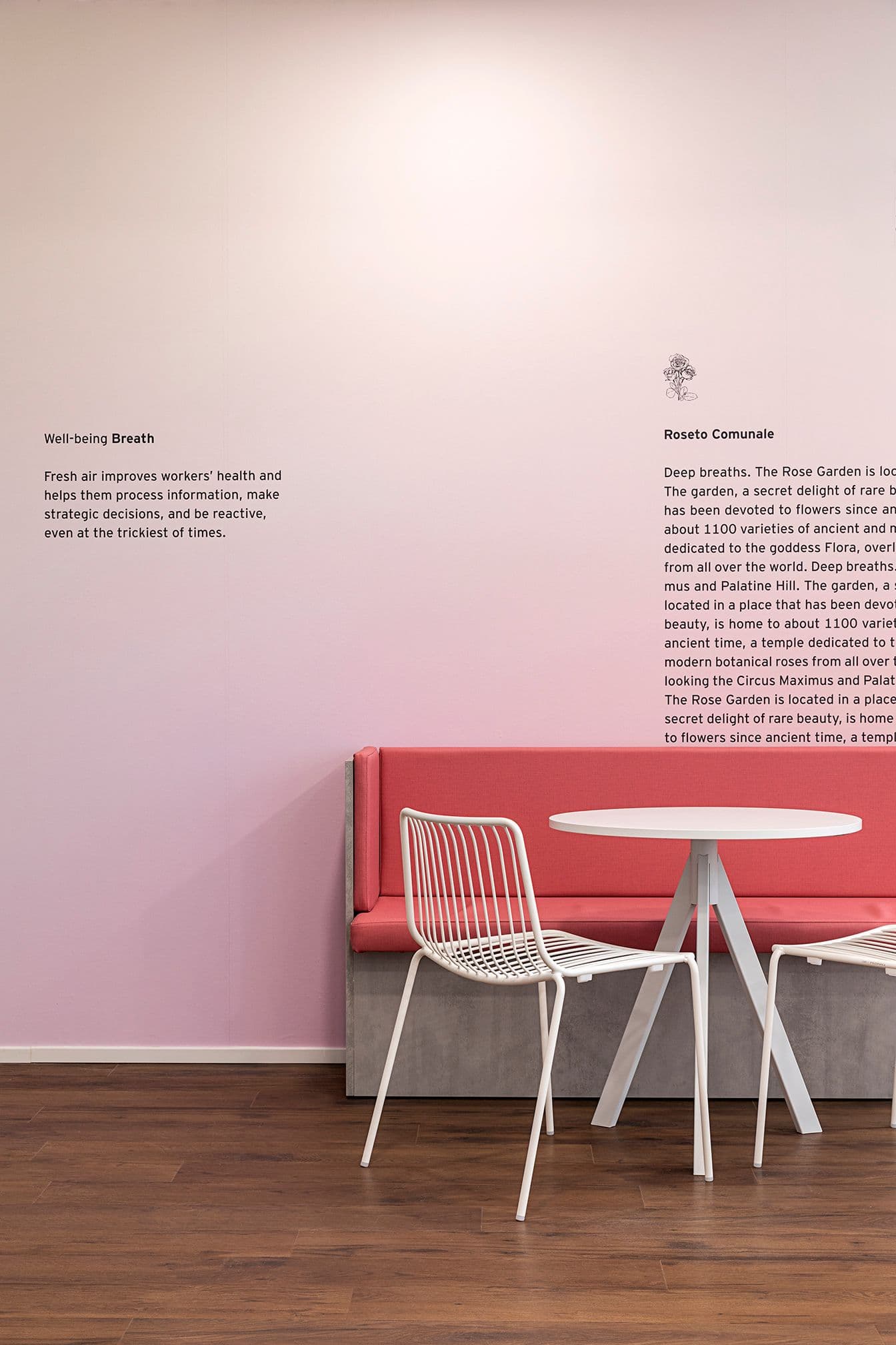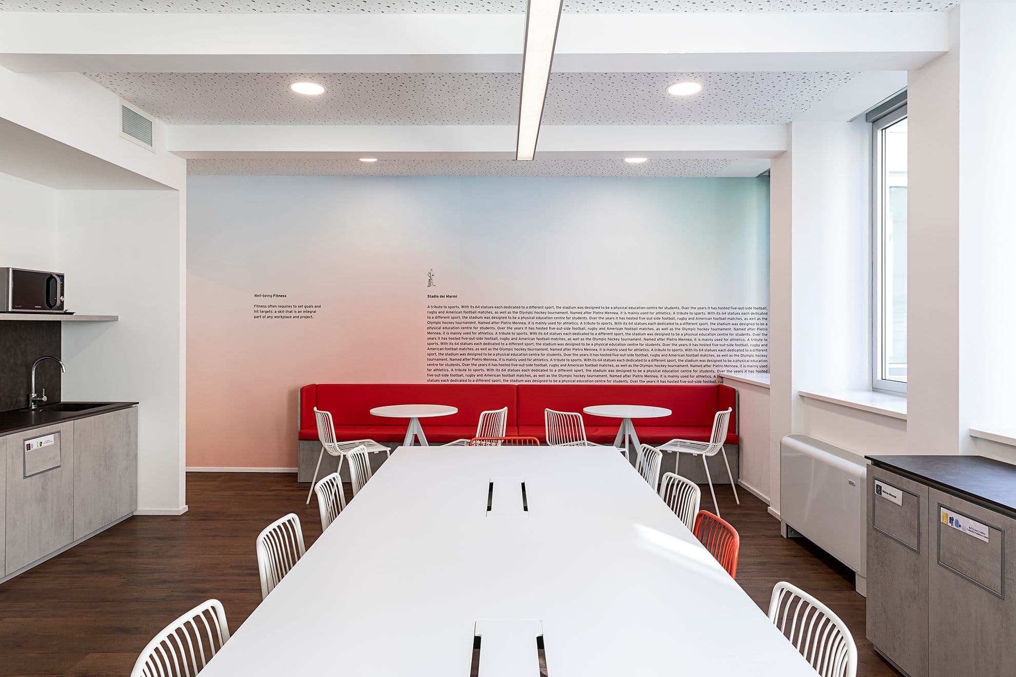 La metafora funge da guida per l’intero intervento e costruisce un’identità spaziale forte, capace di rendere gli ambienti di lavoro più leggibili e dinamici.