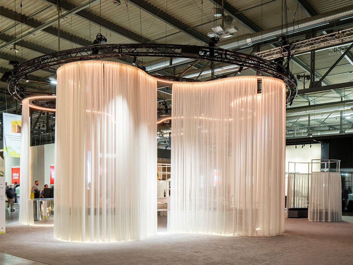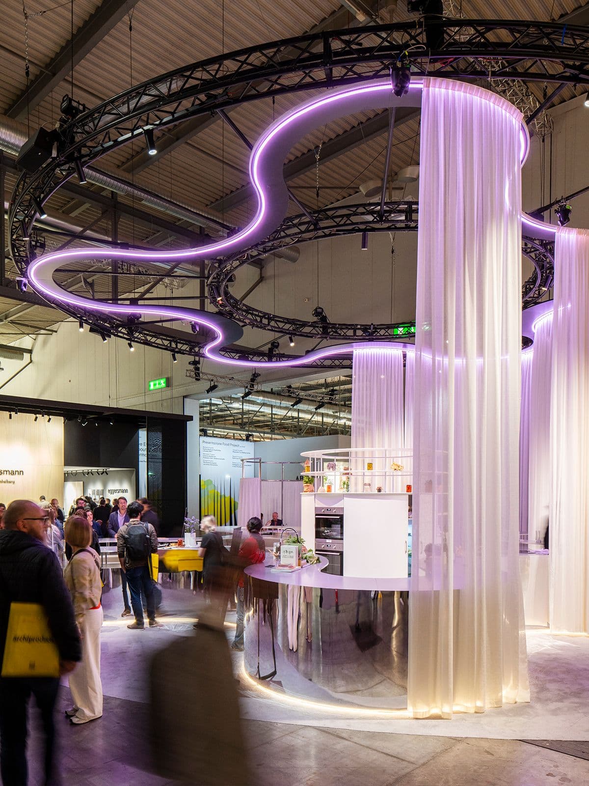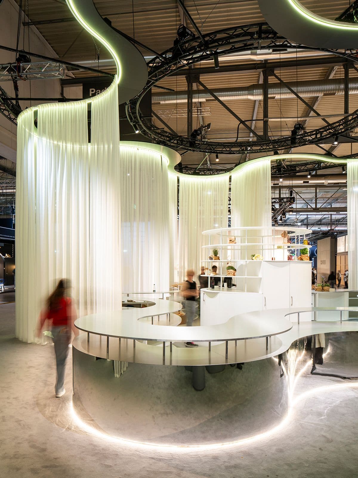 Uno spazio performativo modulare dedicato al food design al Salone del Mobile 2024: superfici mobili, luce dinamica e pareti capaci di trasformarsi.