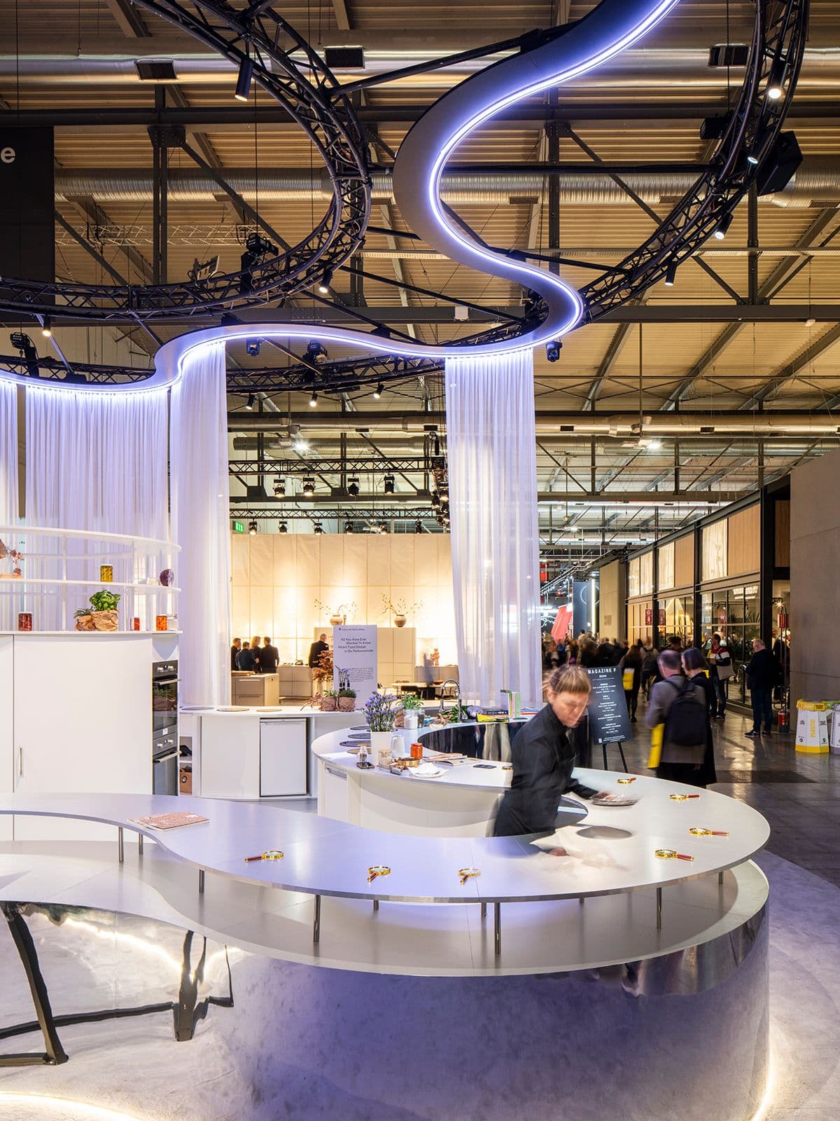 Un grande muro mette in relazione l’area dedicata all’esposizione di magazine e quella per le performance di chef, designer e artisti. Tende mobili e luce variabile permettono di riconfigurare la scena, rendendo l’intero ambiente una tela bianca pronta a colorarsi di identità diverse in tutta rapidità.