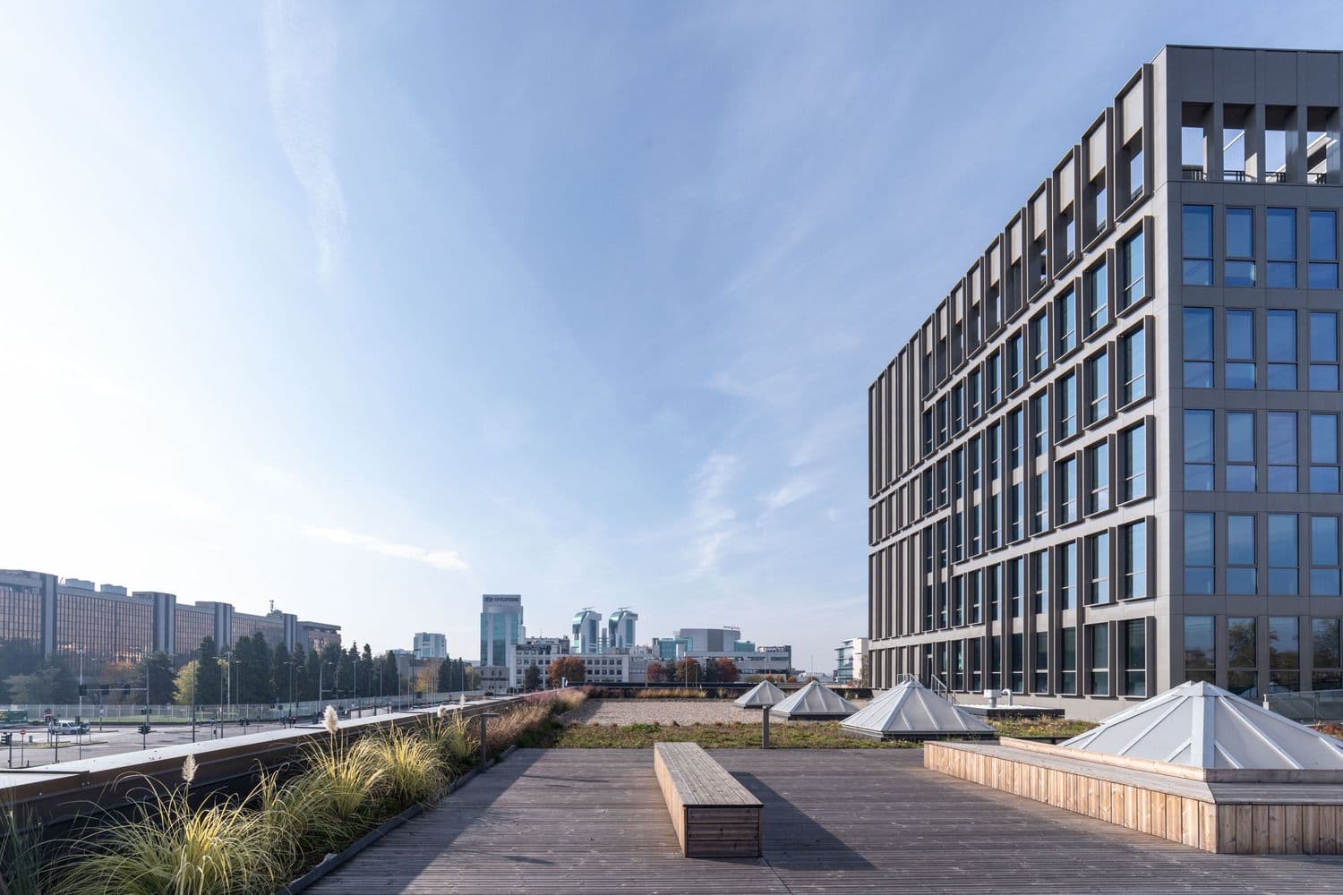 La facciata metallica a doppio colore e i tagli luminosi, uniti al giardino sospeso e alla terrazza verde, posizionano l’edificio come landmark di efficienza e design.