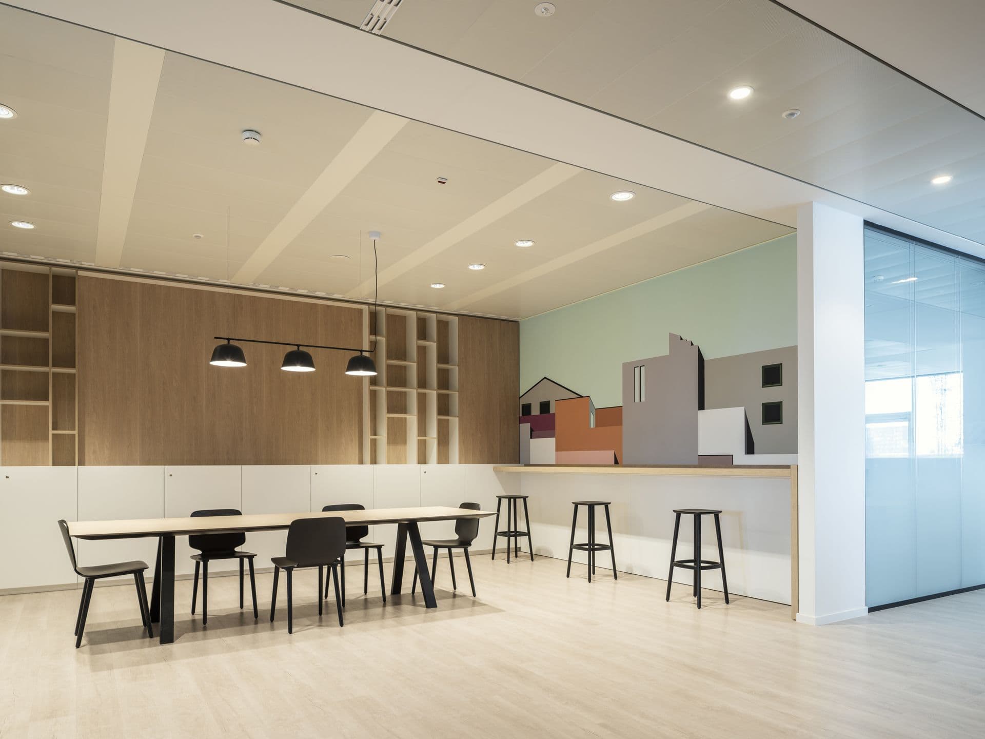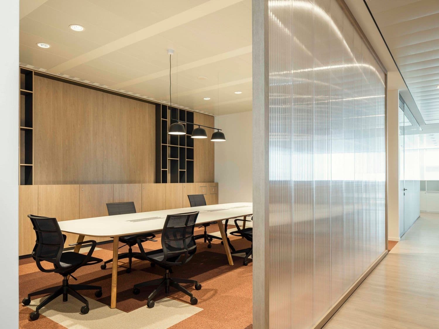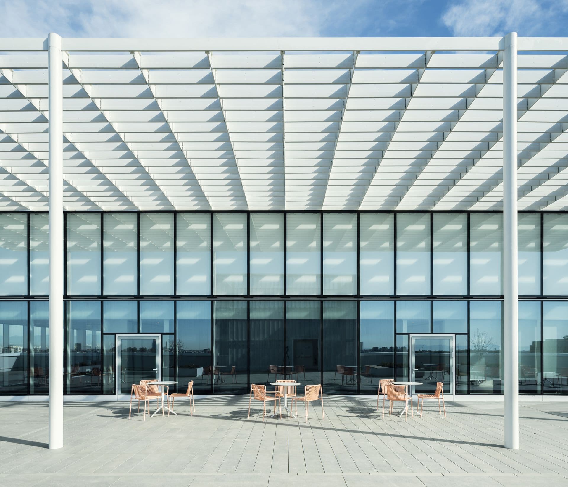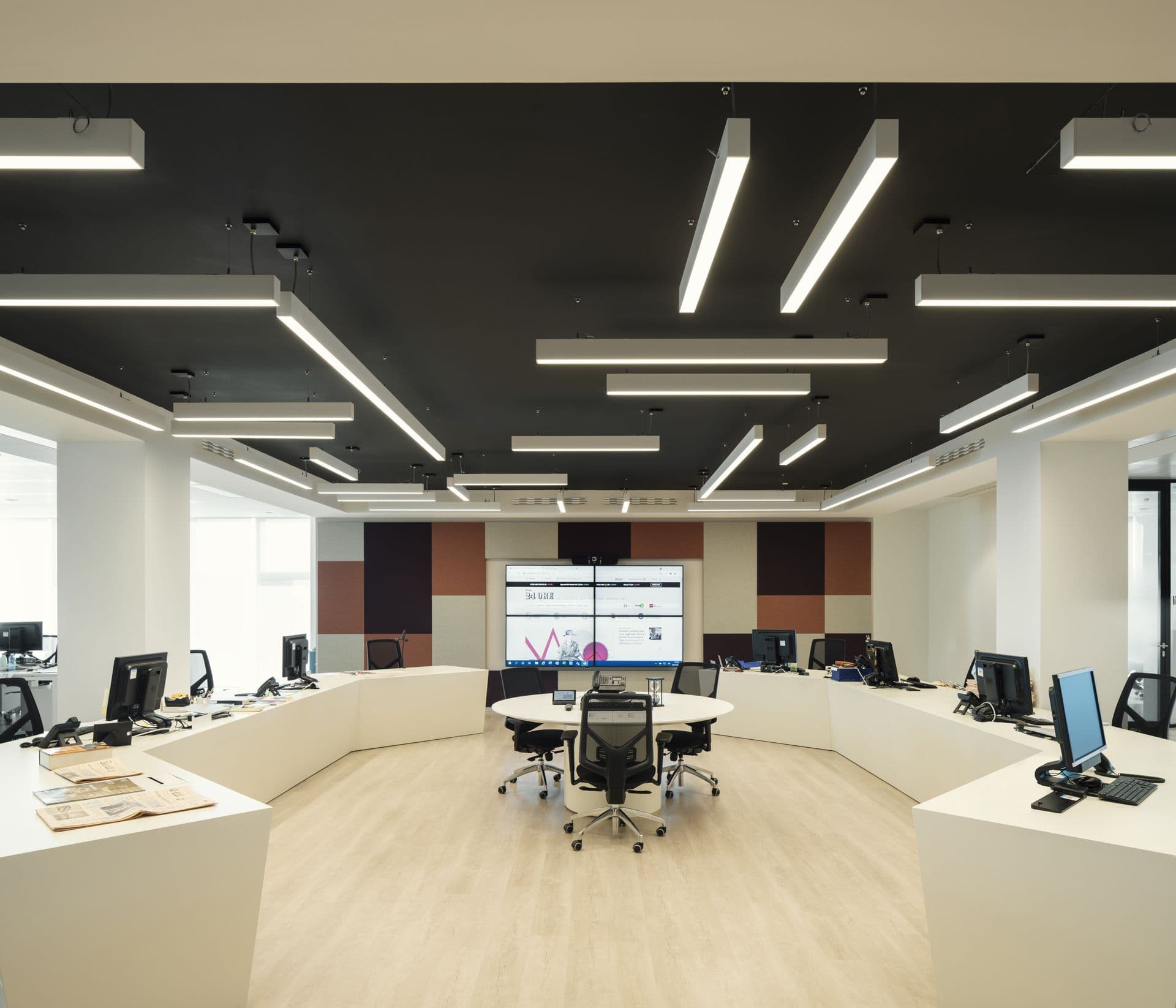 Distribuita su undici piani e 16.000 mq, la nuova sede accoglie aree pubbliche, redazioni, uffici direzionali e spazi d’incontro organizzati intorno a un nucleo centrale, garantendo efficienza operativa e chiarezza dei percorsi. L’alternanza tra ambienti chiusi e open space è arricchita da hub informali e aree recharging. La matrice grafica dell’impaginazione editoriale modella pavimenti, pareti e dettagli, mentre palette di colori tenui e materiali caldi traducono l’identità del quotidiano in atmosfera. Gli spazi integrano sistemi di controllo della luce naturale, superfici fonoassorbenti e alberature interne ed esterne che contribuiscono al microclima e al comfort termico, minimizzando l’impatto ambientale dell’edificio.