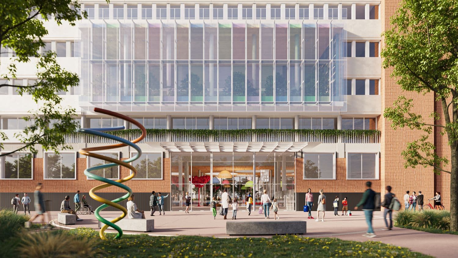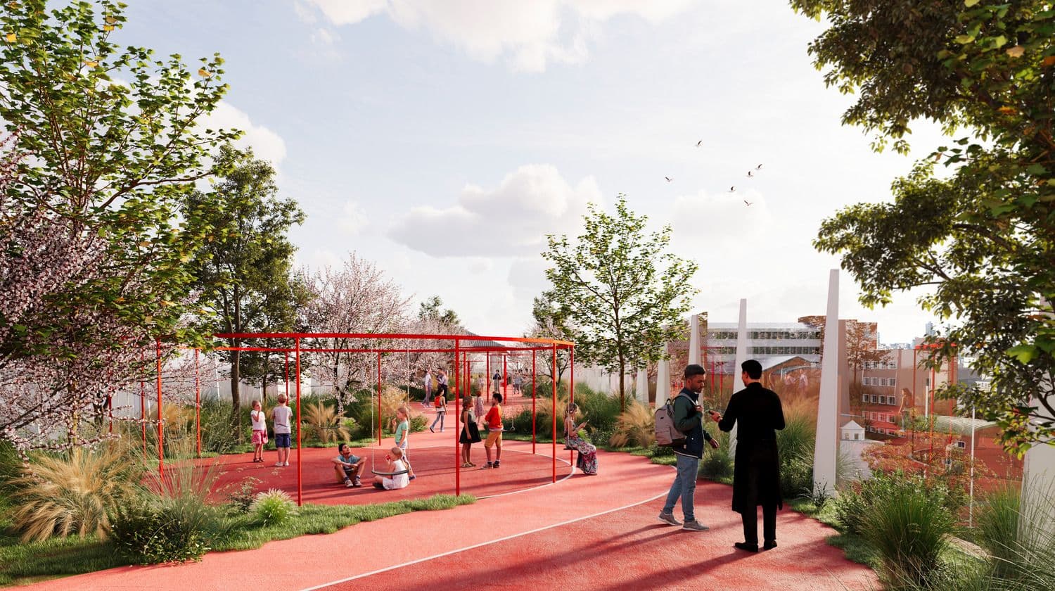 Nel layout viene introdotta inoltre un’agorà, cuore distributivo e luogo per eventi, e un Recreation Center che potenzia identità e funzionalità delle attività sportive. Gli spazi esterni vengono valorizzati e le coperture rigenerate per ospitare laboratori all’aperto e attività di crescita personale, rafforzando la dimensione ecologica e dinamica della scuola.