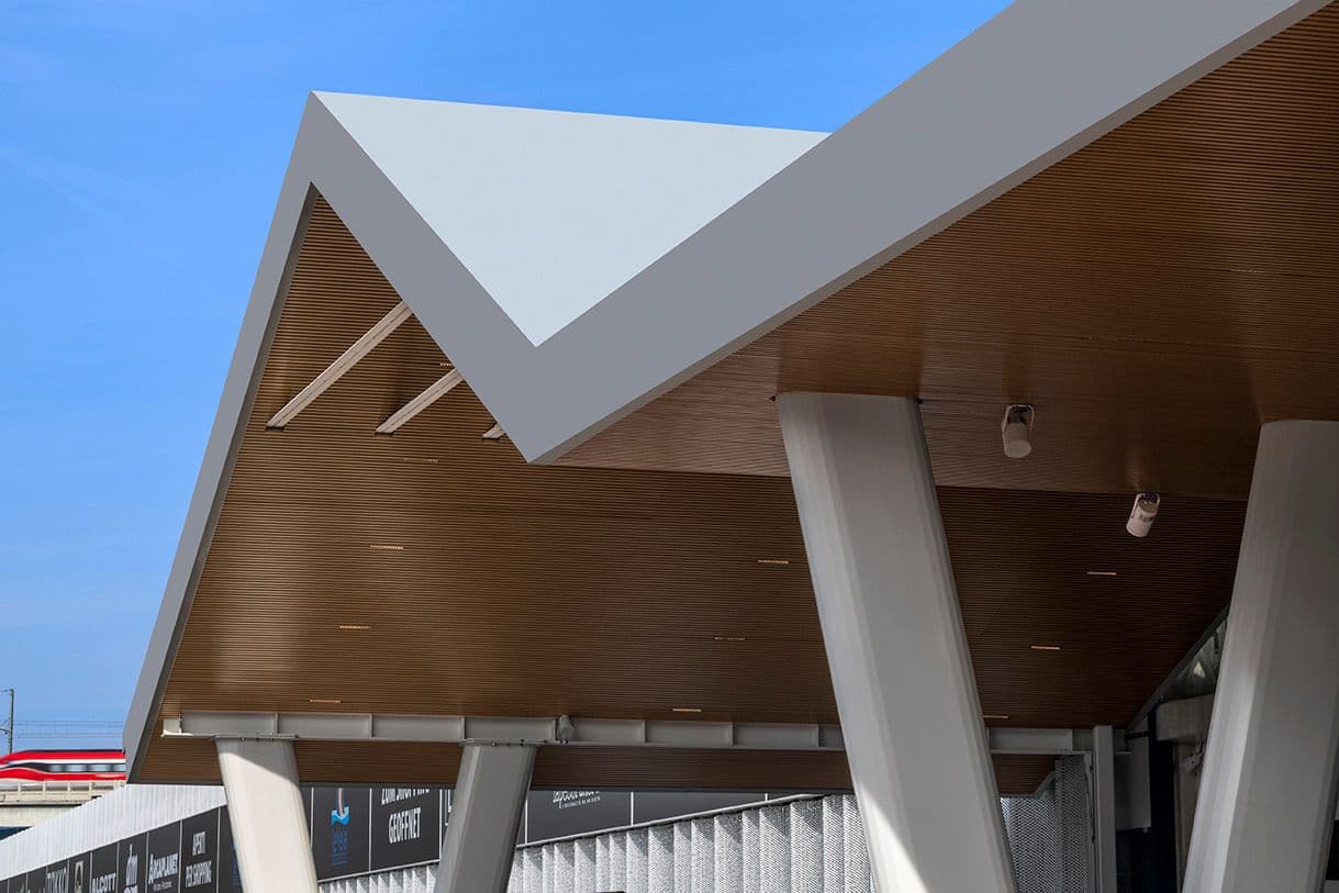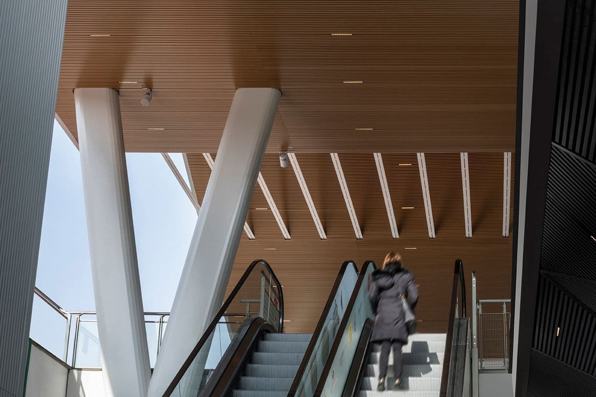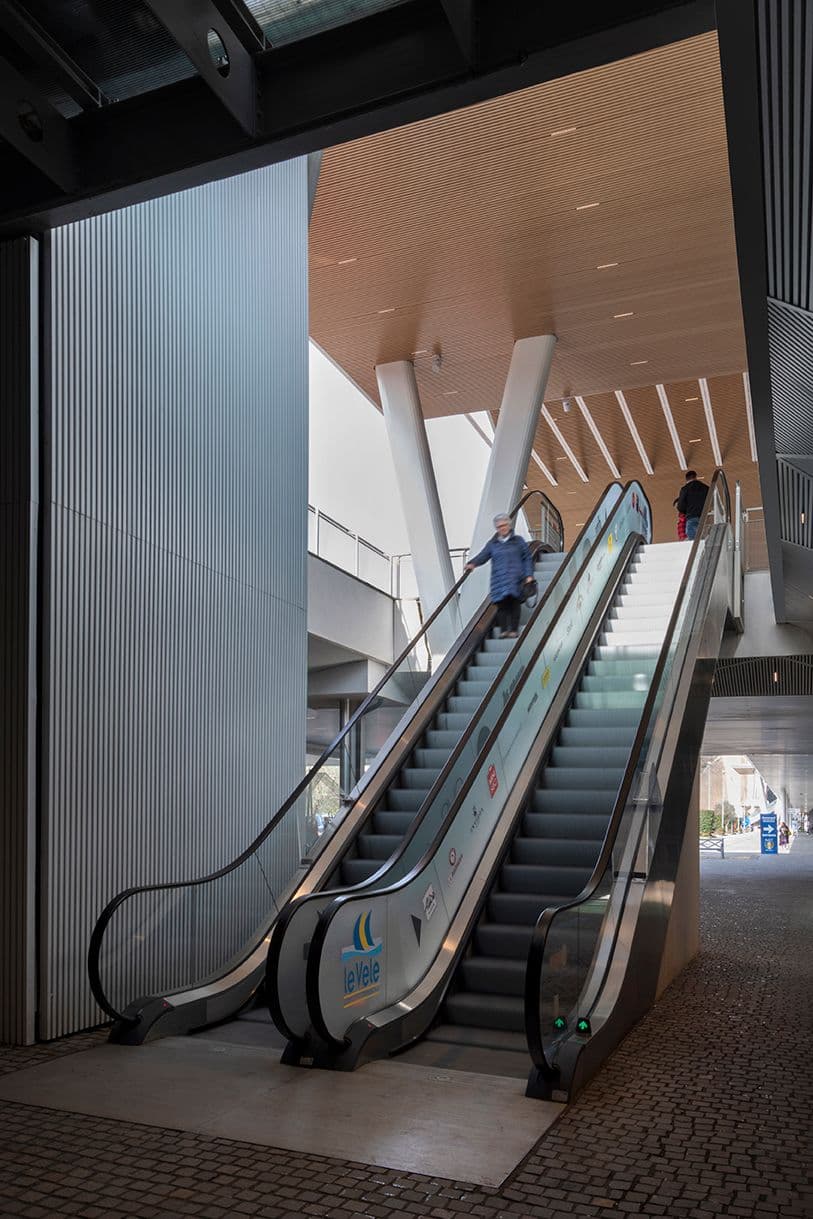 Il moto ondoso dell’architettura del centro commerciale si inserisce in maniera naturale nel paesaggio lacustre, i cui elementi e sistema morfologico eterogeneo sono presi come riferimento per la realizzazione della nuova galleria, definita da un insieme di forme e materiali tipici del contesto locale.
