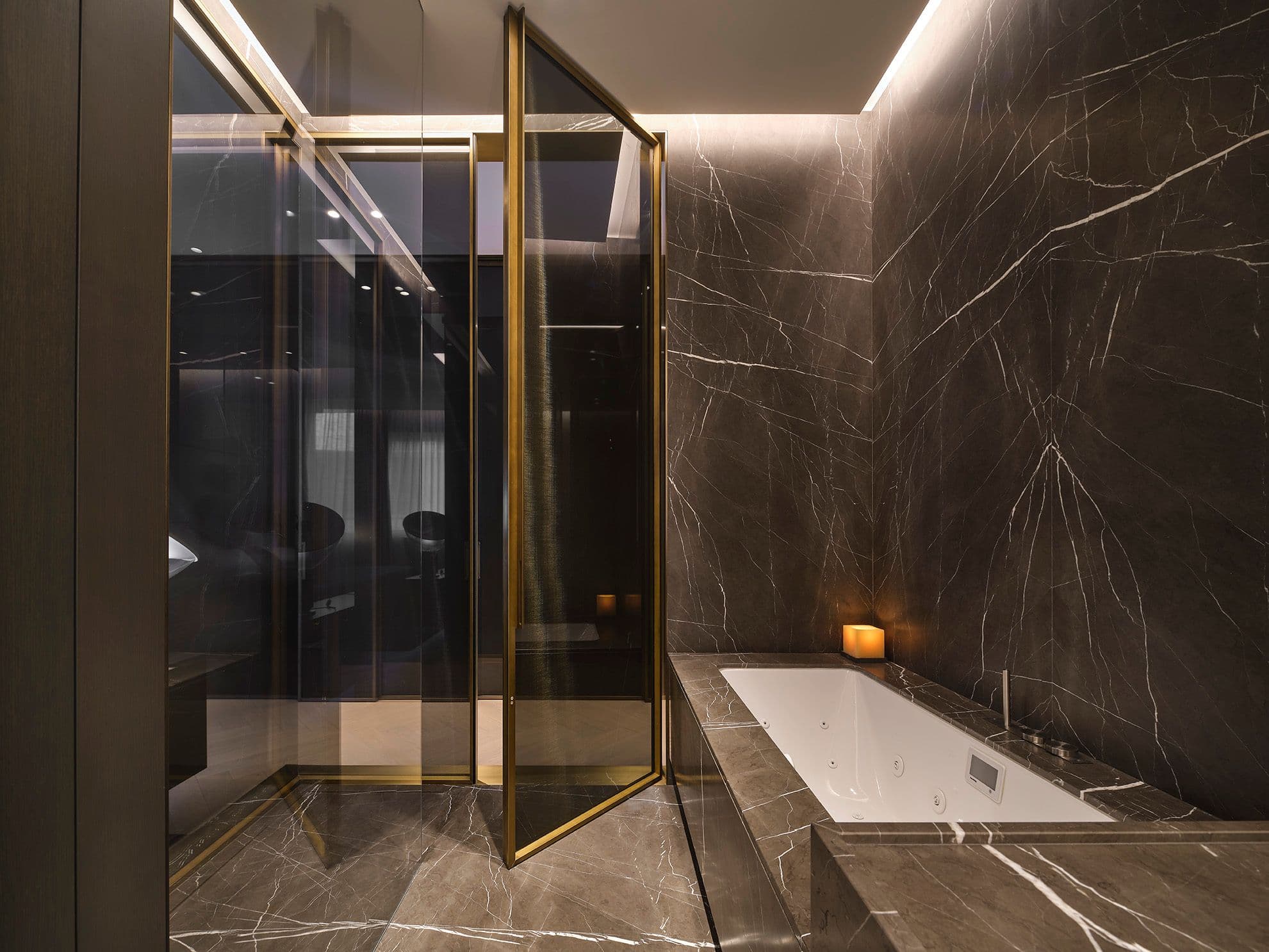 La residenza si sviluppa con un layout flessibile, privo di divisioni nette, dove living, cucina e zona notte si fondono grazie a soluzioni sartoriali e materiali pregiati. La scelta di arredi realizzati su misura, l’uso di vetri, marmi, ottone e boiserie in legno con finiture a base ferrosa creano un ambiente tridimensionale dalle sfumature petrolio. L’illuminazione, studiata per diffondere una luce discreta, rafforza l’atmosfera di benessere domestico. La spa privacy è raggiunta tramite una zona notte che si fonde con l’area bagno, delineando uno spazio pensato per la massima intimità e relax.