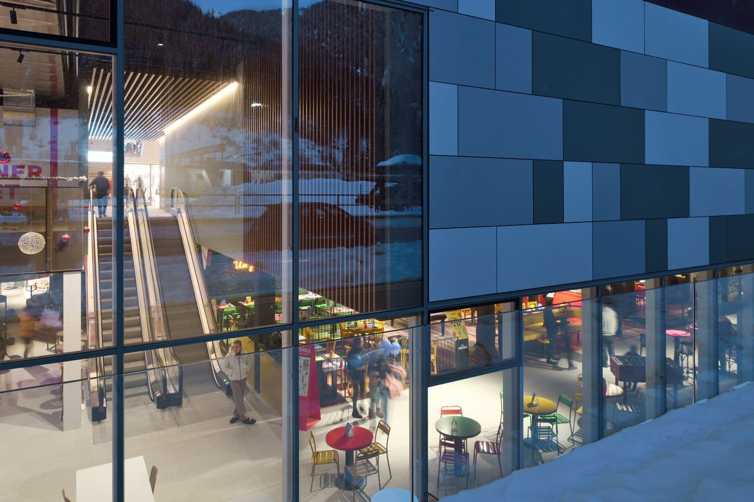 L’outlet dedica alla ristorazione e ai momenti di convivialità uno spazio a doppia altezza, direttamente affacciato sul paesaggio alpino grazie a 500 mq di pareti vetrate, che amplificano il rapporto tra interno ed esterno. Accanto alla food court si sviluppa la piazza ipogea, uno spazio raccolto e accogliente, avvolto da un’ampia gradonata polifunzionale. Questa scelta genera un nuovo livello di connessione, separato dal traffico stradale, e consente di aprire al paese il piano interrato, precedentemente cieco, oggi inondato di luce naturale. La food court porta beneficio anche agli altri brand dell’outlet: la sua posizione incentiva l’attraversamento dell’intera struttura, migliorando la visibilità delle attività commerciali e aumentando il tempo di permanenza dei visitatori.