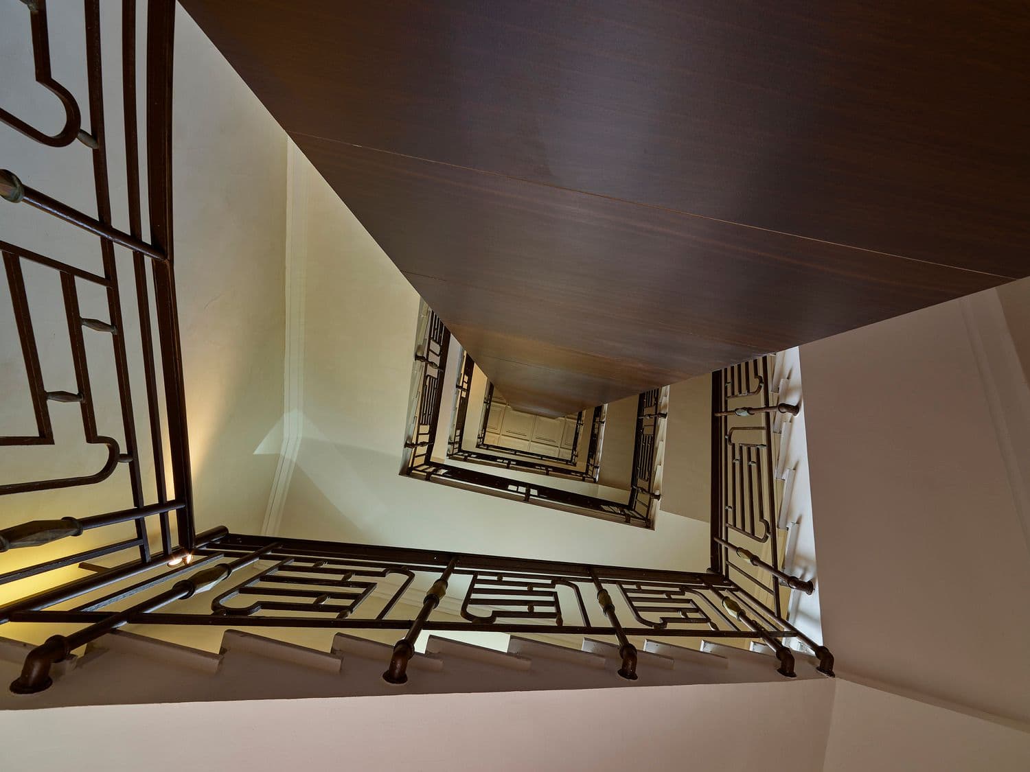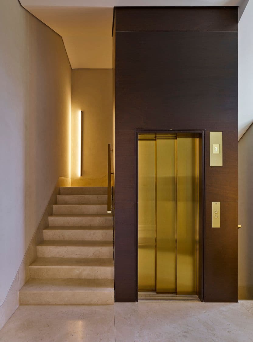 La scala principale è rifinita in seminato, l’ingresso presenta motivi déco in ferro e la decorazione si propaga a pianerottoli e corridoi, con illuminazione teatrale e finiture in marmo e ottone; le aree comuni riprendono materiali e decori preesistenti. Completano l’intervento un nuovo desk reception e il casellario postale.