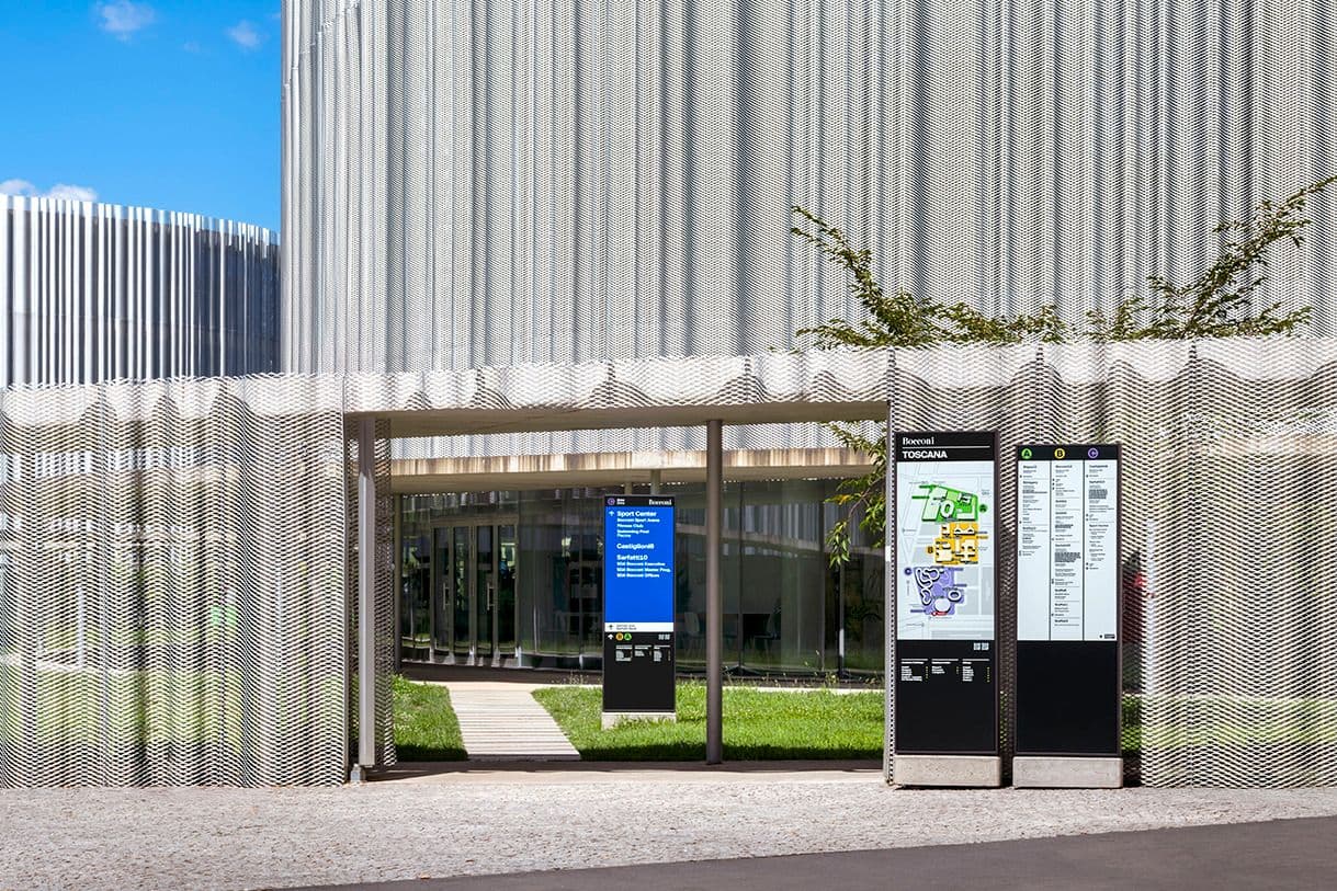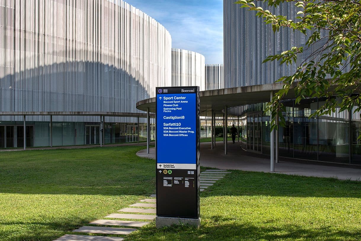 Il sistema si applica a tutti gli edifici del campus, dalla SDA agli altri complessi, e dialoga con architetture di epoche diverse, dagli anni Sessanta ai Duemila, rafforzando il senso di appartenenza alla comunità Bocconi.