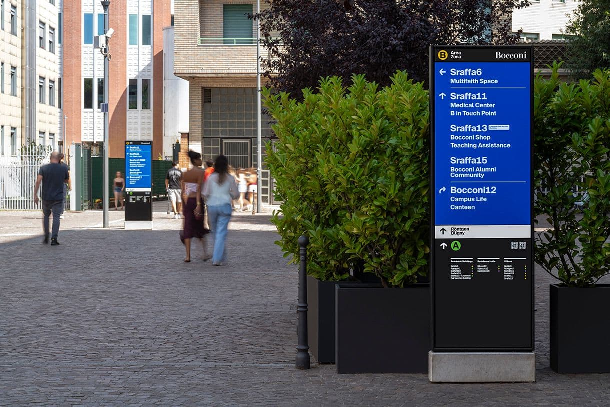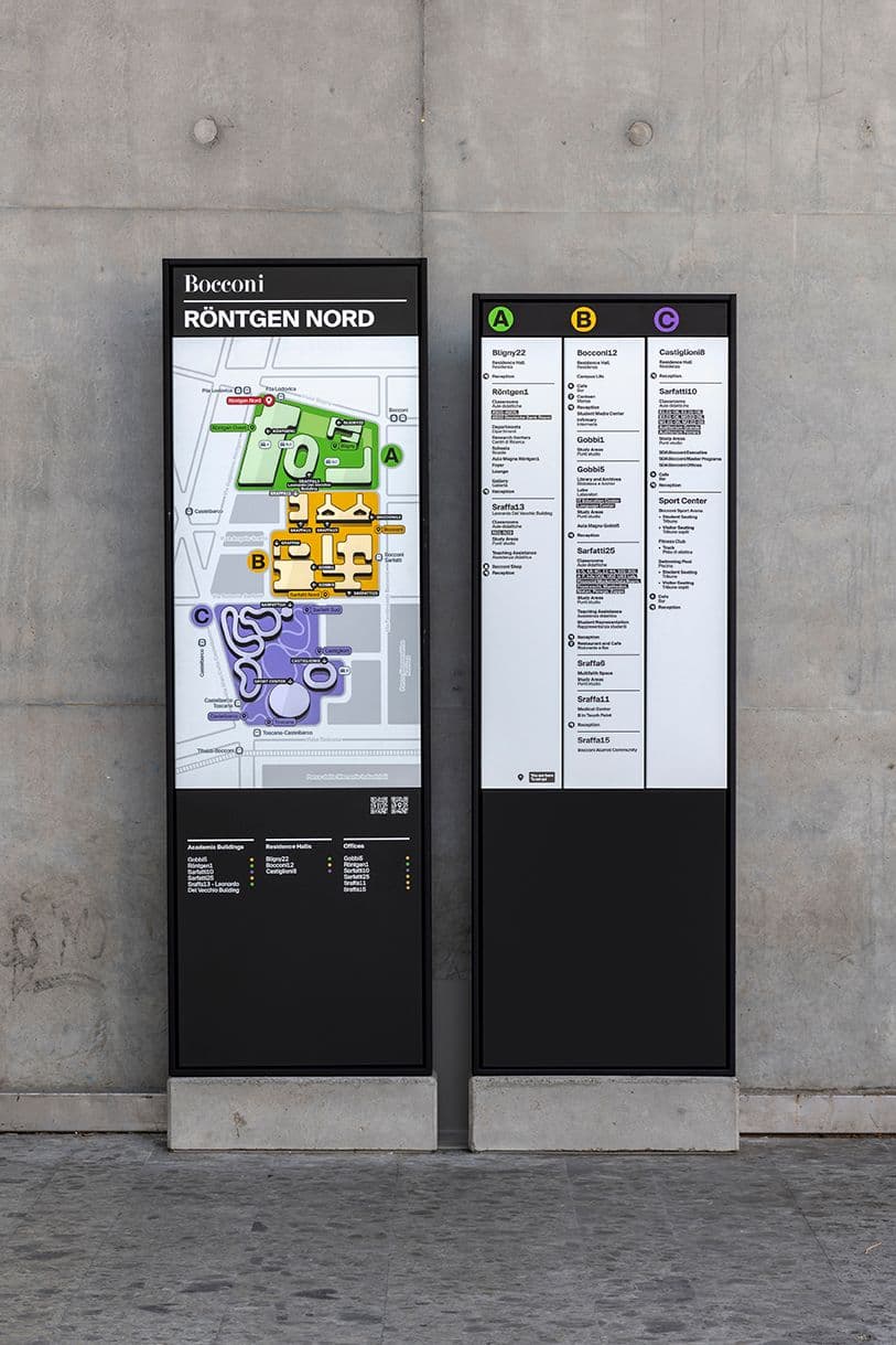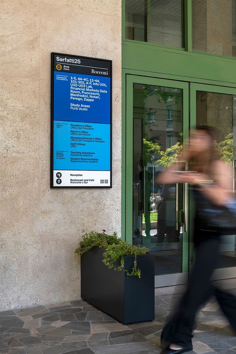 Il Wayfinding dell’Università Bocconi supera il concetto di segnaletica tradizionale e si configura come uno strumento di orientamento capace di trasformare lo spazio in un’esperienza chiara e intuitiva. Il progetto nasce dall’analisi dei flussi e dei comportamenti delle persone che attraversano il campus, applicando le teorie di Space Syntax per individuare spazi chiave, percorsi principali e nodi di orientamento. Il sistema interessa tutti gli edifici dell’ateneo, mettendo in relazione architetture storiche e contemporanee attraverso un linguaggio visivo volutamente neutro, in grado di dialogare con contesti differenti senza sovrapporsi. Alla segnaletica analogica si affianca un livello digitale: i QR code rimandano a contenuti informativi sviluppati dall’Università Bocconi, ampliando l’esperienza orientativa. La scelta cromatica e grafica è centrale nel progetto. I colori ad alto contrasto, il carattere tipografico a bastoni scelto appositamente per il campus e il disegno dei pittogrammi contribuiscono a rendere il sistema immediato e riconoscibile. I pittogrammi, sviluppati a partire da quelli universalmente condivisi, sono stati reinterpretati per incorporare l’identità Bocconi, mentre le mappe sono state ridisegnate e semplificate per migliorarne chiarezza e qualità visiva. Un lavoro approfondito sulla gerarchia dei contenuti, sviluppato insieme all’Università, ha permesso di uniformare la denominazione degli edifici e definire un abaco di regole condivise. L’introduzione delle aree A-B-C ha reso il campus più leggibile e permeabile, distinguendo aree prima indifferenziate e rafforzando la relazione con il quartiere circostante.