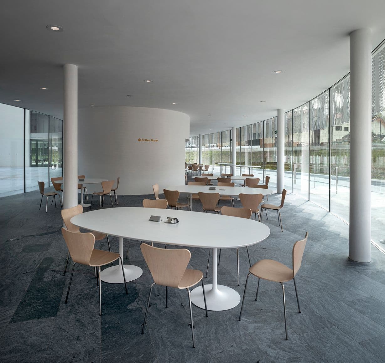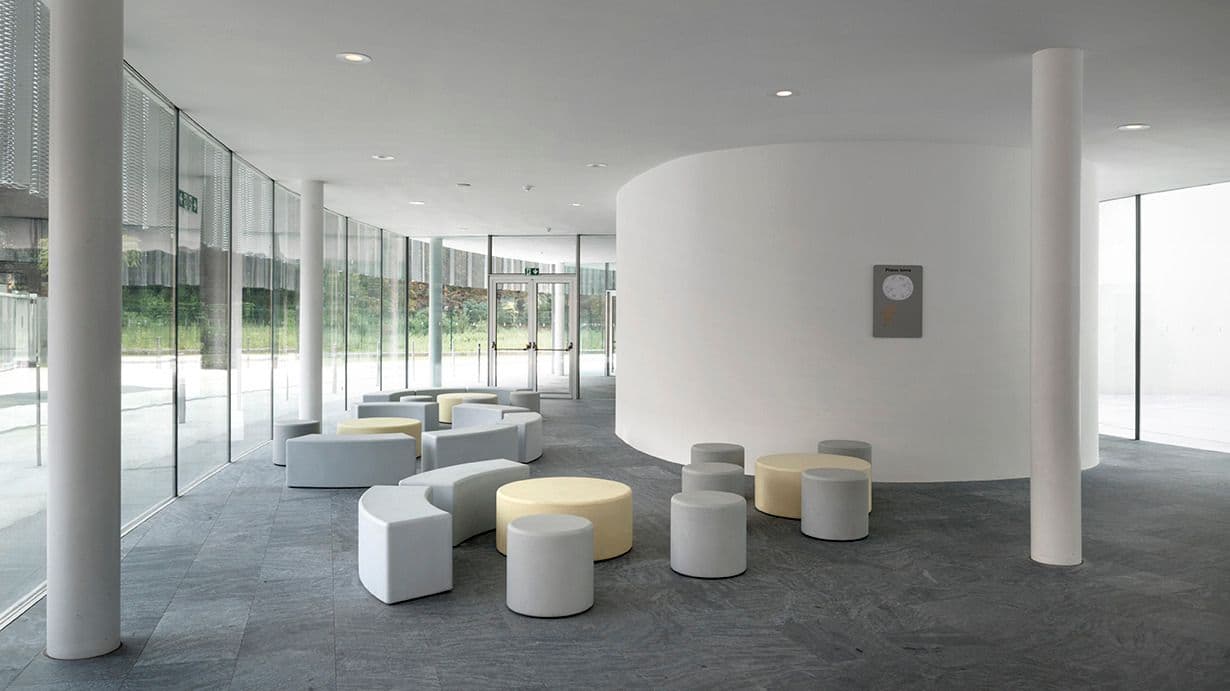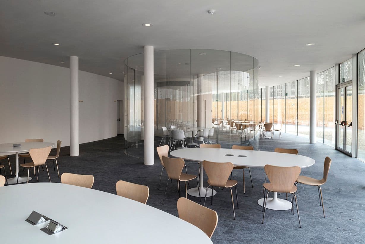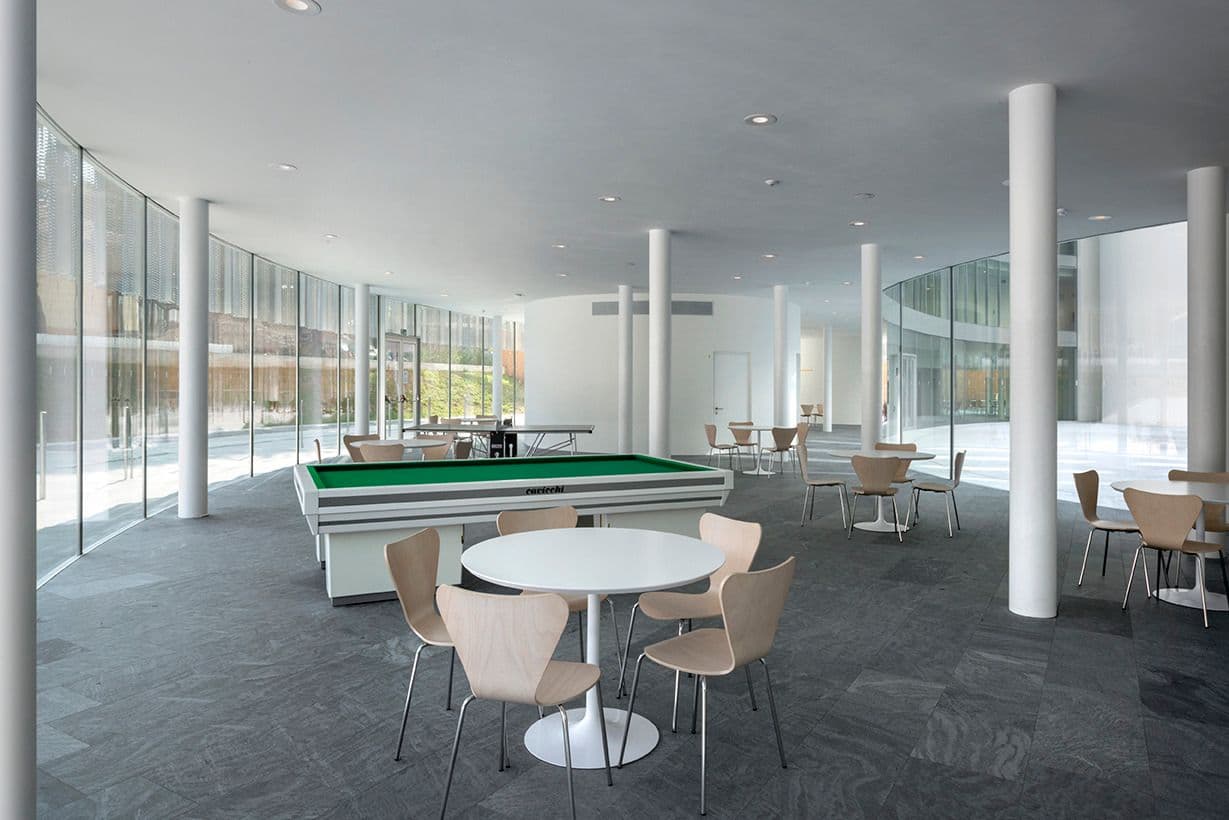 La hall di ingresso principale dell’intero complesso, la reception, i locali per il controllo e la sicurezza, una reception accoglienza e la zona di amministrazione.