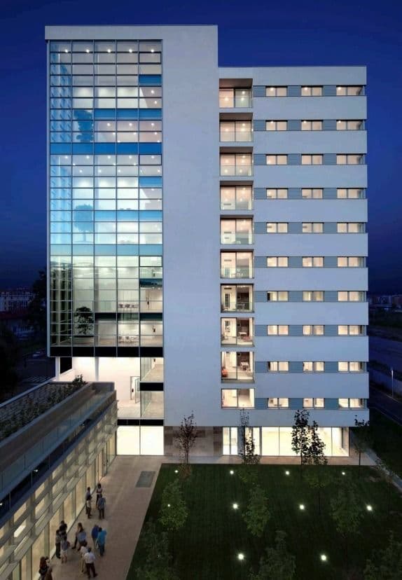 Il piano terra della nuova costruzione ospita spazi comuni, reception, fitness e aree ricreative attorno alla corte centrale, con grandi vetrate che aprono visuali verso la città e si collegano con il contesto urbano. Il complesso offre 97 camere in formula alberghiera e 116 appartamenti di varia tipologia, pensati per diverse esigenze: camere singole con bagno privato, soluzioni con bagno condiviso, unità con più camere, bagni e cucina.