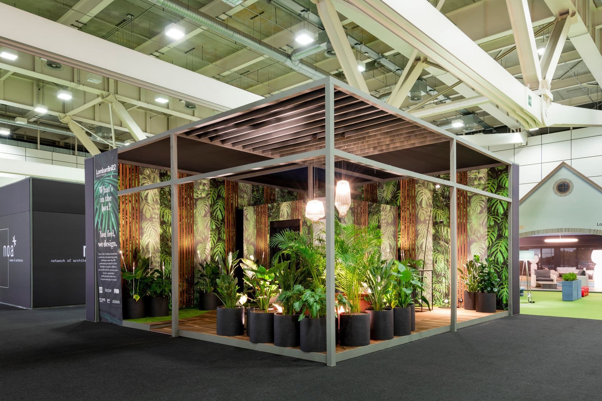“What’s in the box?” introduce un modo inedito di vivere la fiera nello spazio dedicato a al dialogo tra produzione, progetto e committenza. Su un perimetro di 8x8 metri, il layout mette in relazione due sequenze: quella esterna, dove una lounge con prato, piante e superfici in teak è arredata con sedute avvolgenti, e quella centrale, dove un volume introverso è rivestito con una pellicola specchiante, accessibile tramite un passaggio filtrante. Luce, suono, colore e aria costruiscono un ambiente immersivo a bassa stimolazione che invita a rallentare e vivere la visita in modo consapevole.