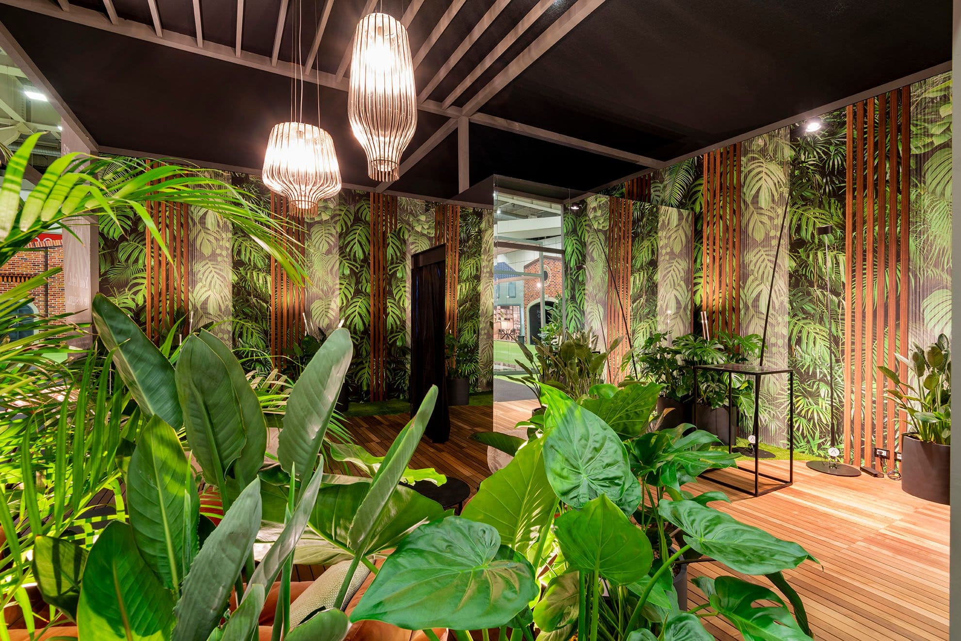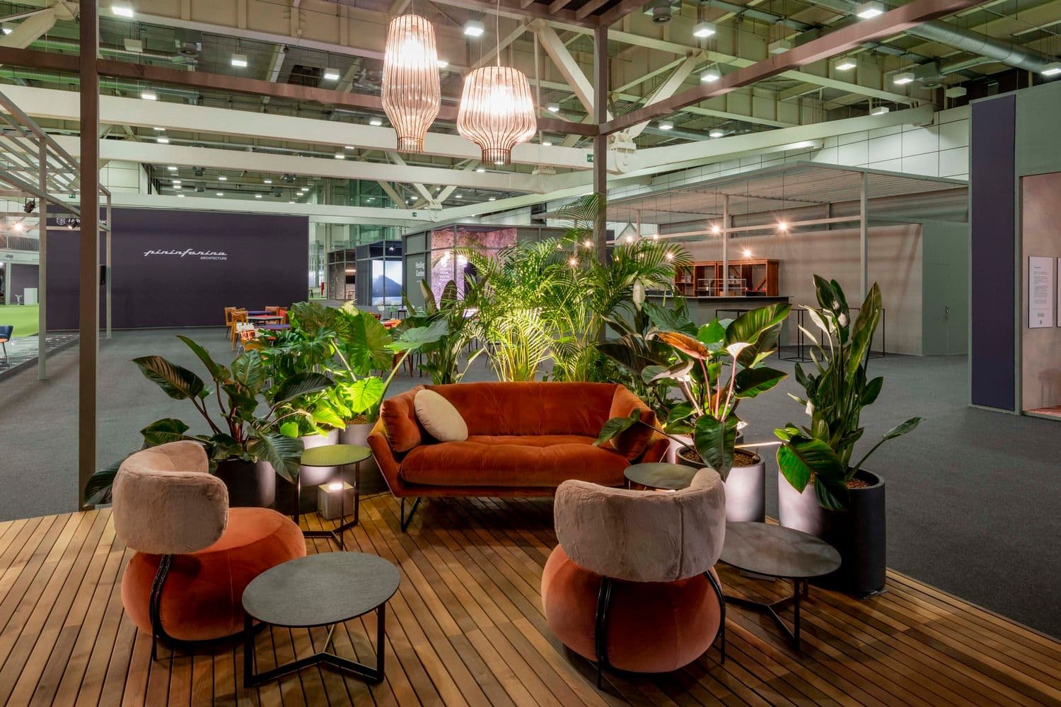 Lo spazio unisce una lounge verde e accogliente a un volume specchiante raccolto, offrendo ai visitatori una pausa sensoriale dal ritmo della fiera.